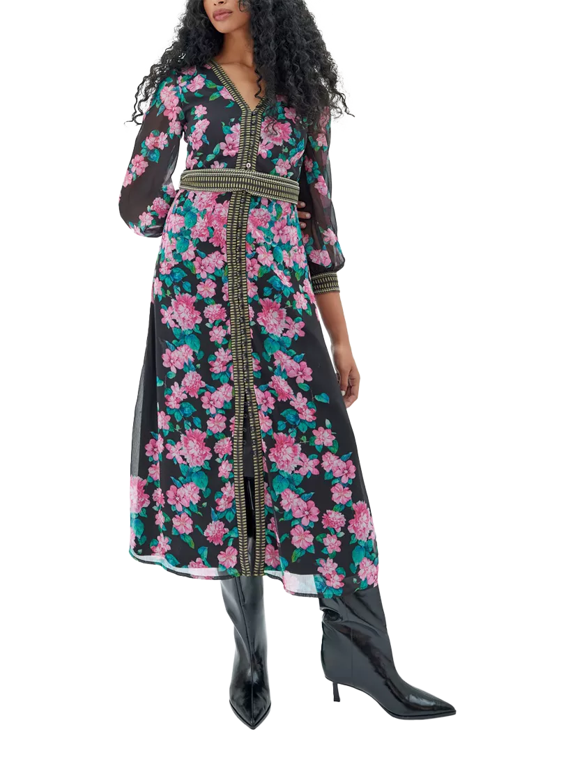 Embrace the allure of the Athena Black Dress, where floral fantasy meets chic sophistication. This captivating midi dress boasts a deep black backdrop illuminated by blush pink florals, perfect for any season. The design features a V-neckline, cinched waist with tie detail, and elegant border accents. The sheer long sleeves add a touch of mystery to your ensemble. Whether for a casual meet-up or an evening event, the Athena Dress is a versatile addition to your collection.