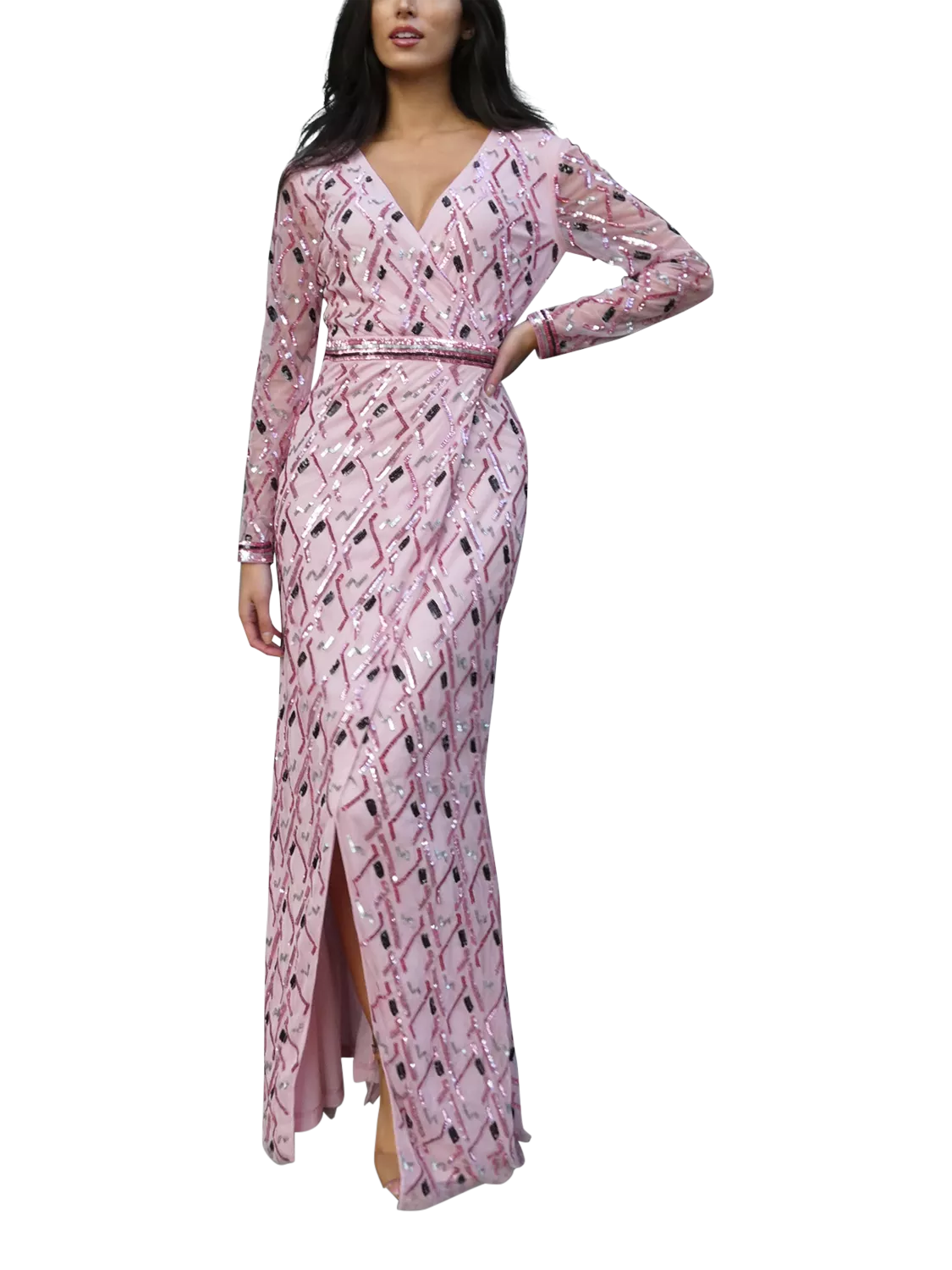 Embrace elegance with the Birdie Gown, a radiant long-sleeve wrap dress that captivates with its intricate diamond print and a slit. This pink masterpiece, highlighted by a shimmering waistline accent, offers a perfect blend of charm and sophistication. Ideal for galas or romantic evenings out, the Birdie Gown pairs seamlessly with your favorite heels. Shop now for a touch of effortless glamour!