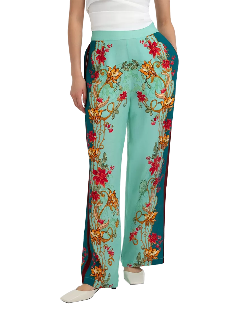 Flowy wide-leg trousers crafted from soft viscose fabric with a vibrant floral print. Designed with a high-waisted fit and contrast border detailing, they offer a stylish yet comfortable silhouette.