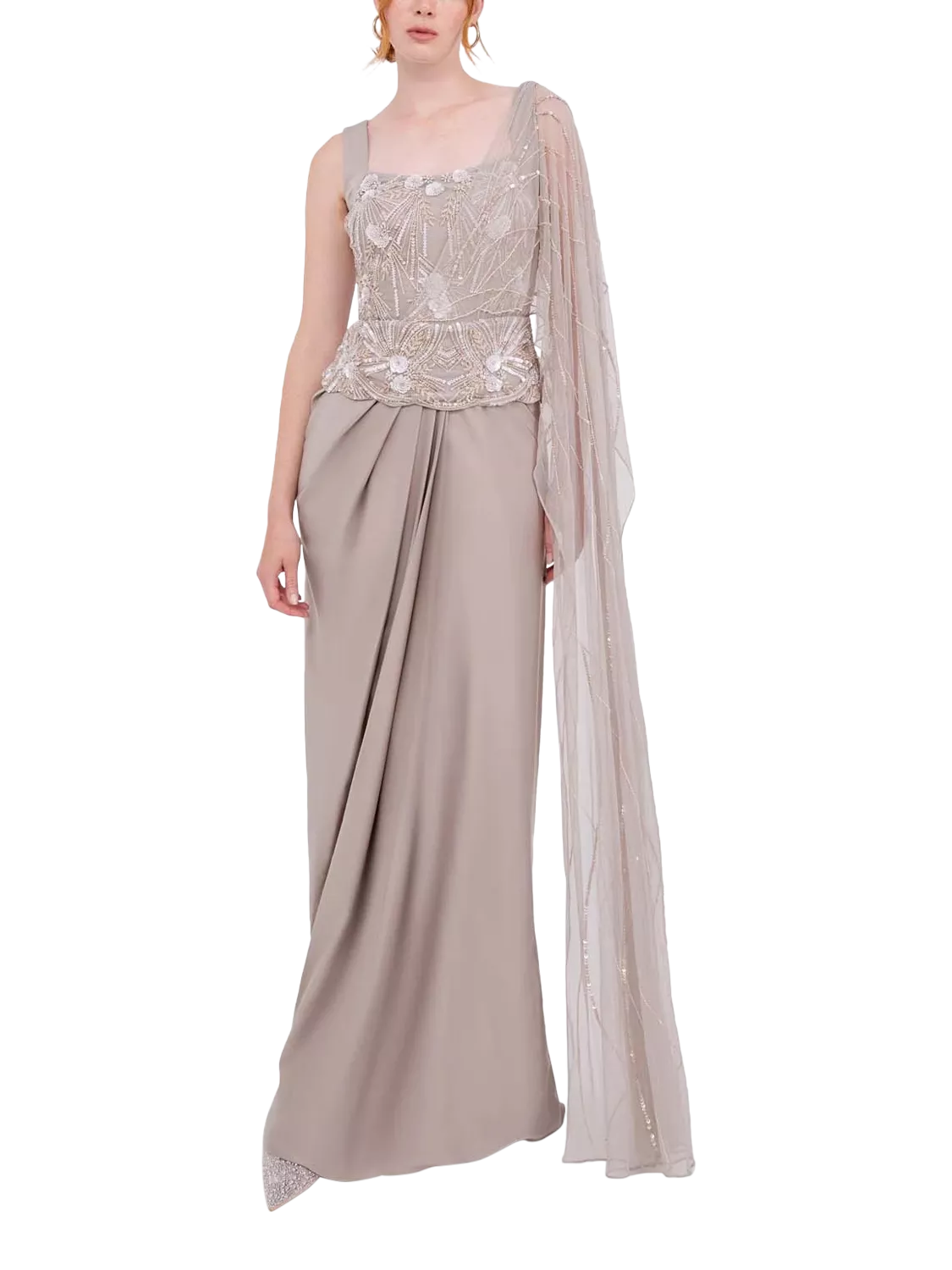 An elegant beige gown featuring a sequined bodice with intricate floral patterns and a sleeveless design. The dress includes a draped skirt and a delicate sheer dupatta-style drape adorned with subtle embellishments. Ideal for formal occasions, this outfit combines classic charm with a contemporary silhouette.