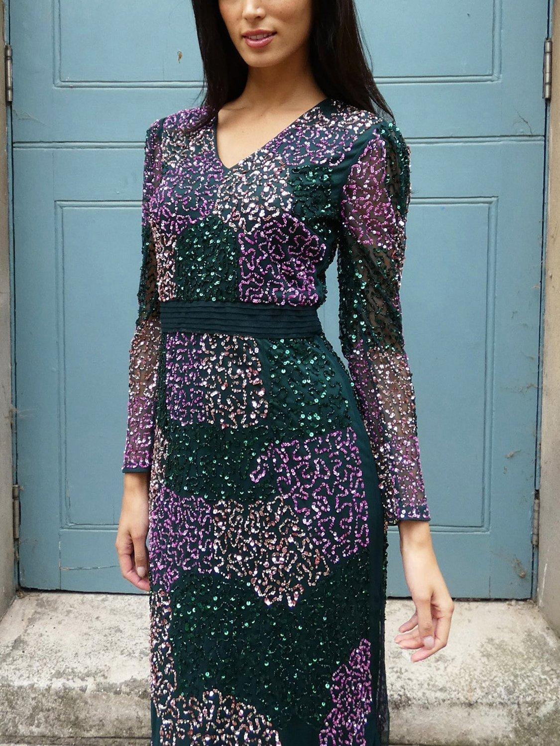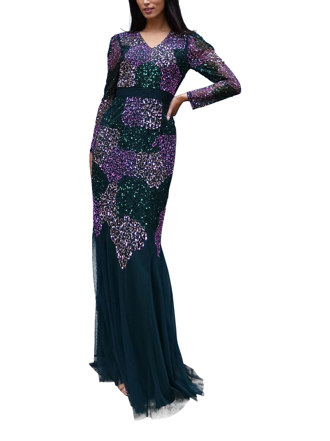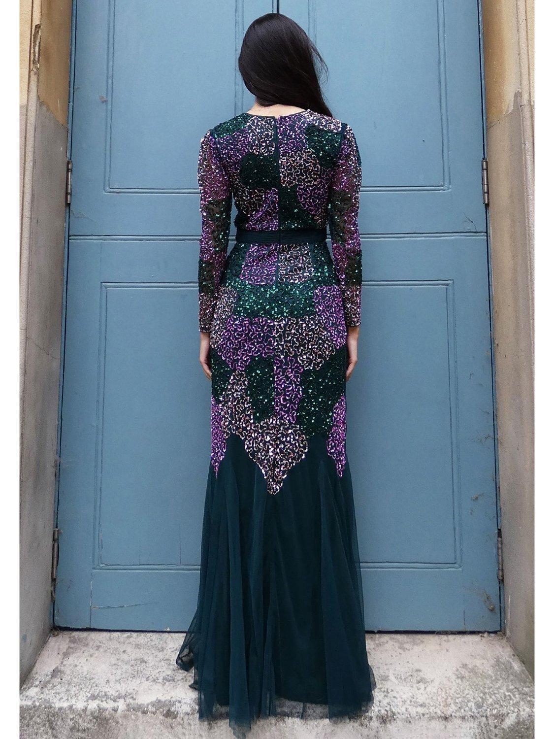The Ester Gown is a dazzling display of artistry, featuring a palette with vibrant sequin patterns. This full-length dress merges bold colour contrasts with an elegant silhouette, making it a captivating choice for formal events. For a night where you aim to impress, the Ester Gown is the embodiment of sophistication.