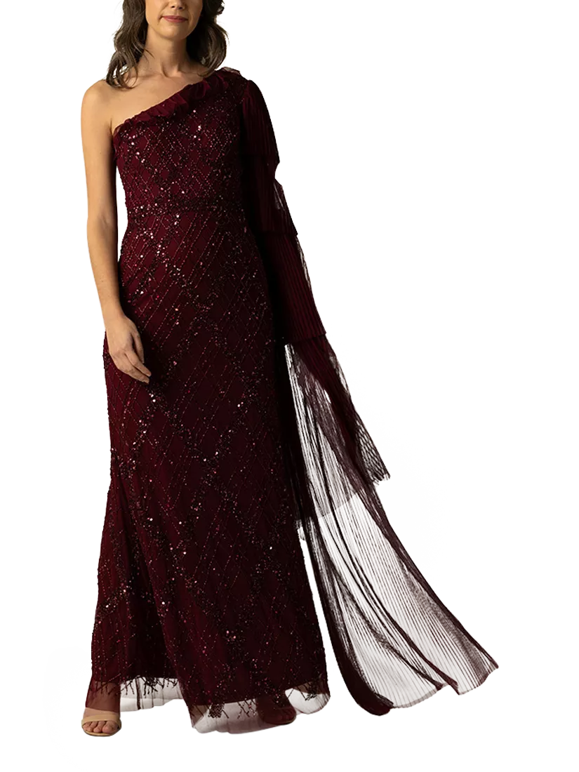 Embrace the evening in the Leilani Gown, a masterpiece of burgundy brilliance. Adorned with intricate sequin work, this one-shoulder gown drapes beautifully, finished with a sheer, pleated sleeve that adds movement and depth. Perfect for weddings, red carpet events, or any occasion where elegance is a must. The Leilani Gown is a show-stopping piece that promises a lasting impression.