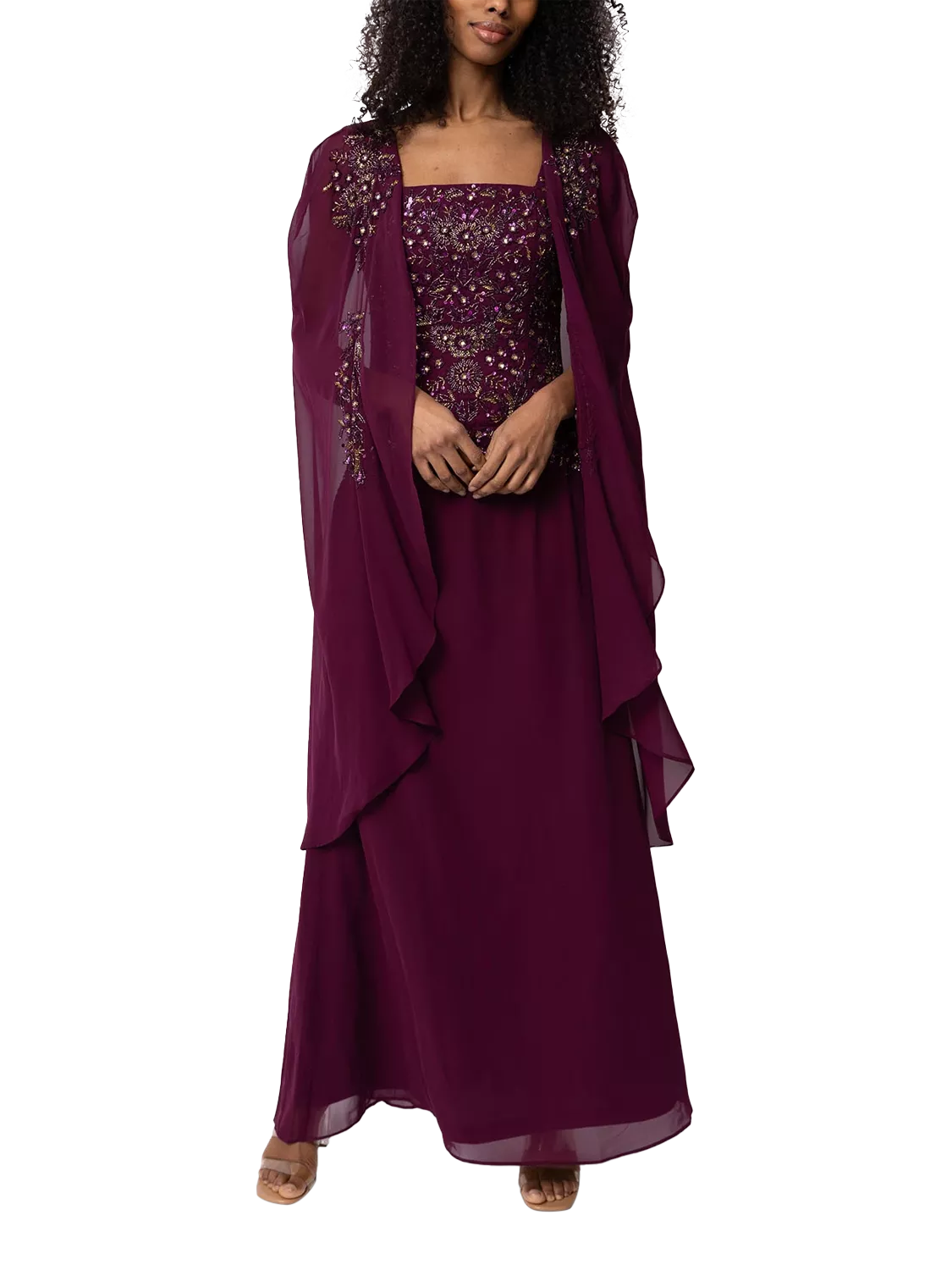 Elegance exemplified with the Leonora Gown, where regal colour meets luxurious embellishments. This gown features a sequin-adorned bodice that cascades into a fluid chiffon skirt, accompanied by a matching sheer cape for a touch of drama. Perfect for evening galas or high-profile weddings, it's a dress that promises a grand entrance. Find your exquisite look with the Leonora Gown.