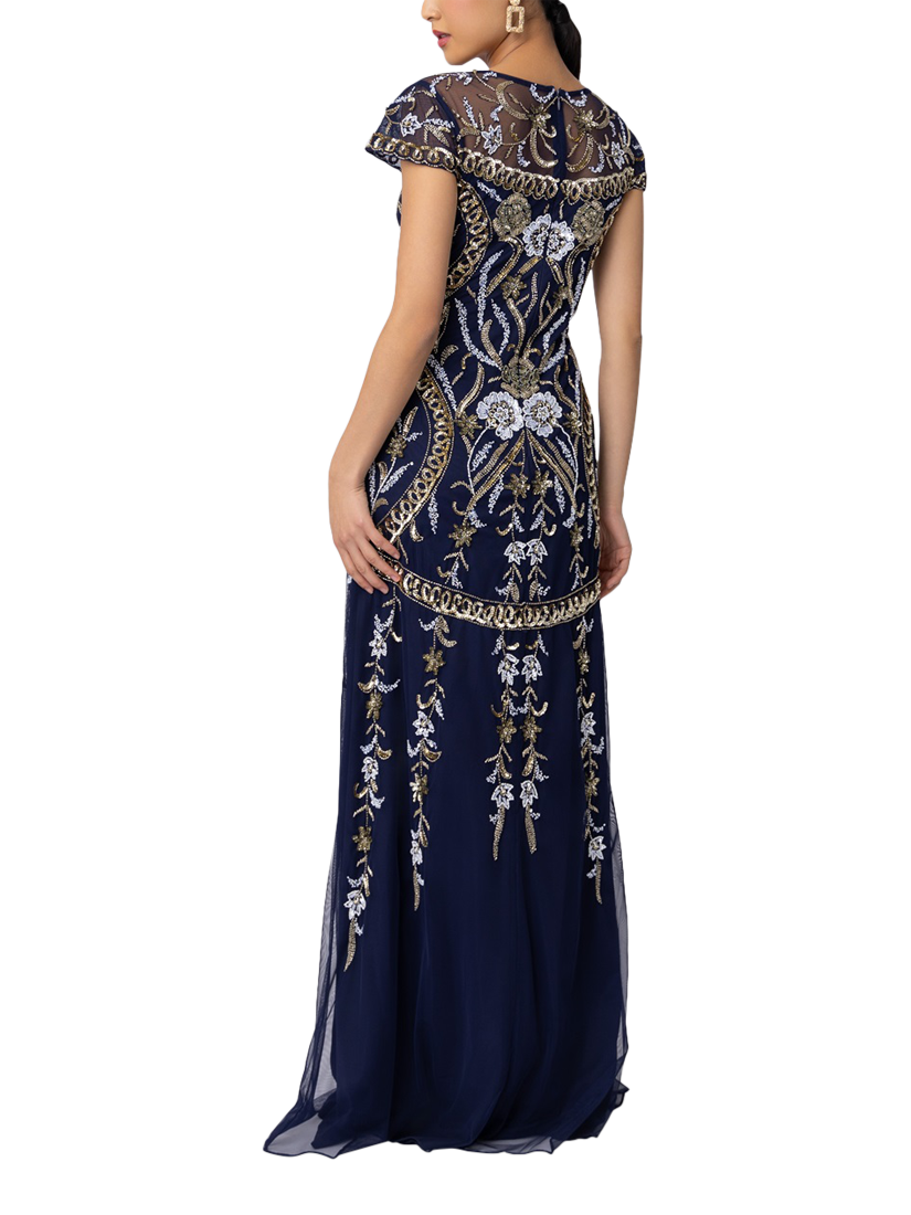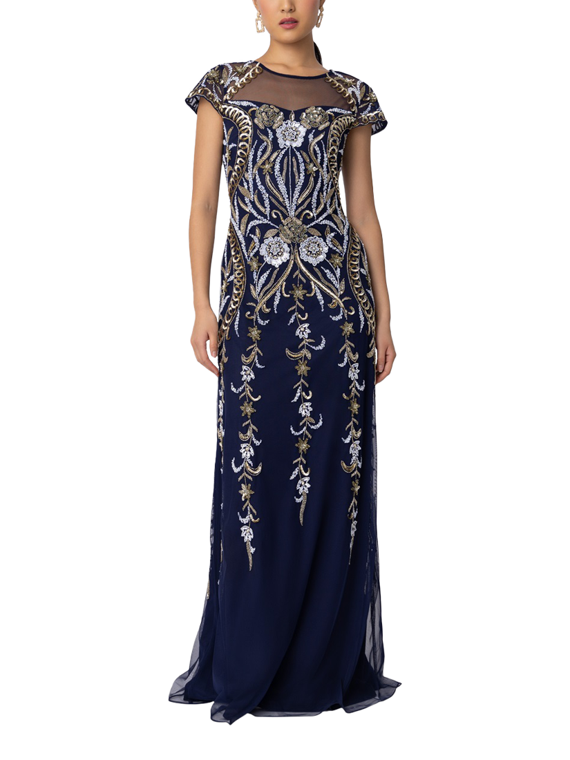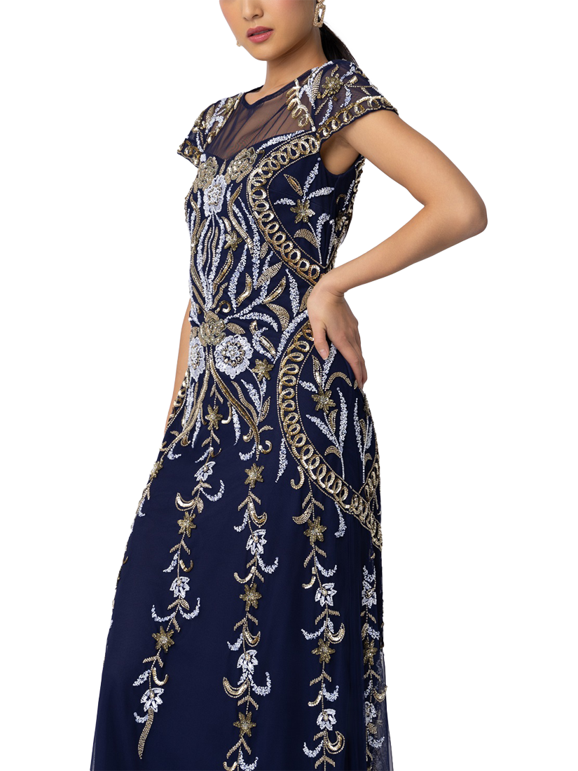 Step into a world of timeless luxury with the Maris Gown, a regal navy masterpiece perfect for the most sophisticated occasions. Adorned with golden and silver embroidery, this gown exudes a majestic charm. The cap sleeves and full-length design provide a flattering silhouette for all body types. Ideal for evening events, the Maris Gown is your ticket to feeling like royalty. Capture the essence of elegance and make a statement at your next event.