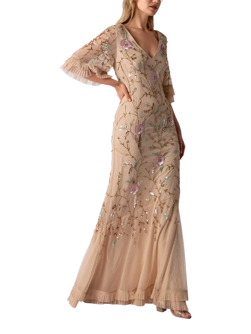 Radiate in the Natalie Gown, a blush-hued masterpiece adorned with pastel florals and sparkling sequins. Its elegant V-neck and flutter sleeves complement the fitted bodice, flowing into a gently flared hem for a touch of romance. Perfect for bridesmaids or spring formals, the Natalie is a blend of sophistication and whimsy. Embrace the enchantment of the Natalie for your next memorable occasion.