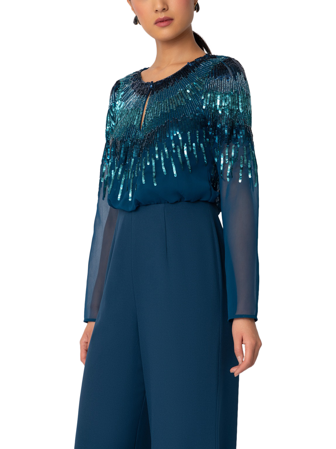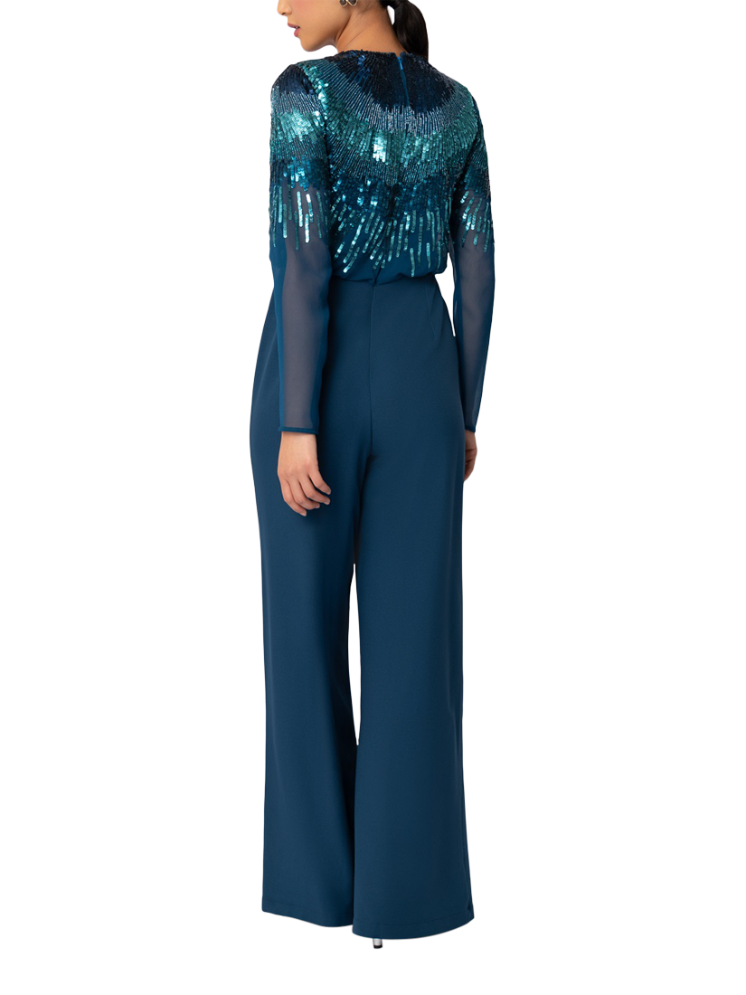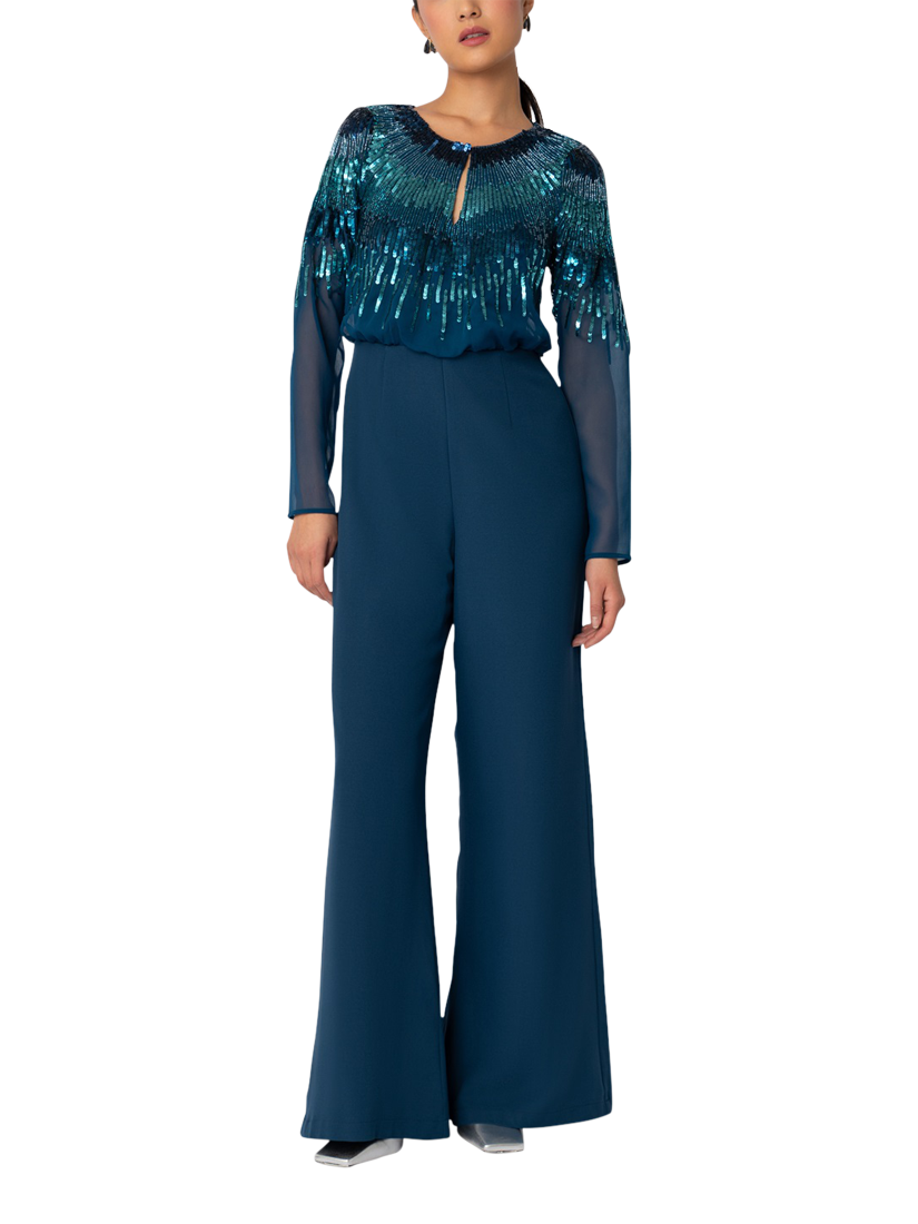 This elegant jumpsuit features a shimmering sequin bodice with long, sheer sleeves, offering a striking contrast to the flowing wide-leg pants. The subtle keyhole neckline adds a touch of sophistication, perfect for evening wear or special occasions.