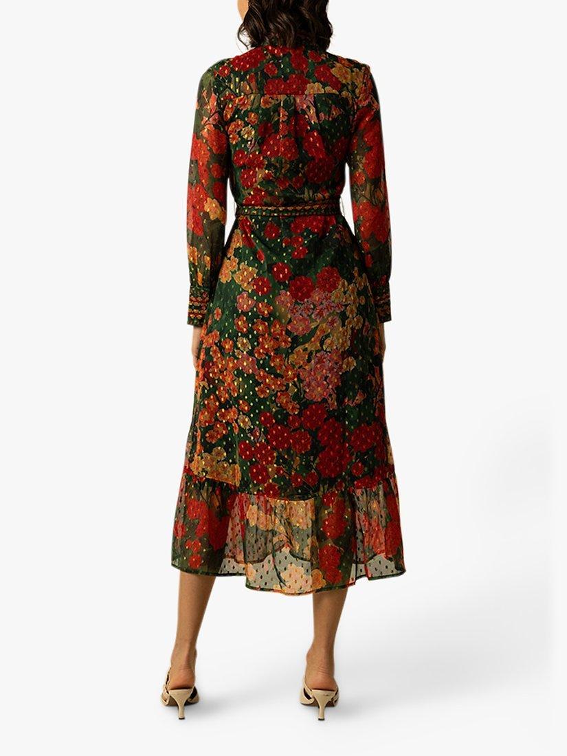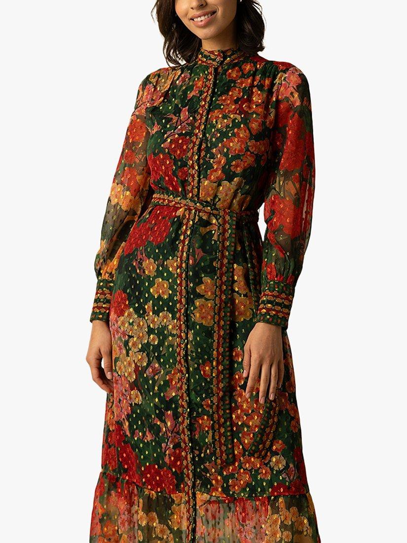The Olive Dress is a rich tapestry of autumnal colours. This midi dress is draped in a lush floral print, accented by golden flecks and a high neckline. Its long sleeves and the crinkle chiffon fabric create a silhouette that's both comfortable and elegant. Finished with a waist-defining belt, the Olive Dress is a staple for seasonal festivities or sophisticated day-to-day wear.