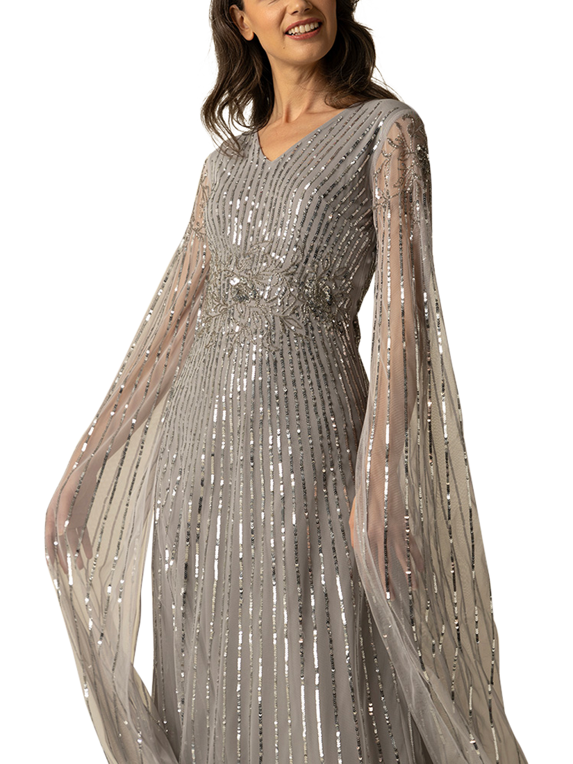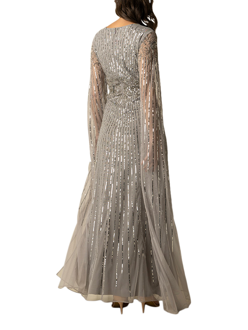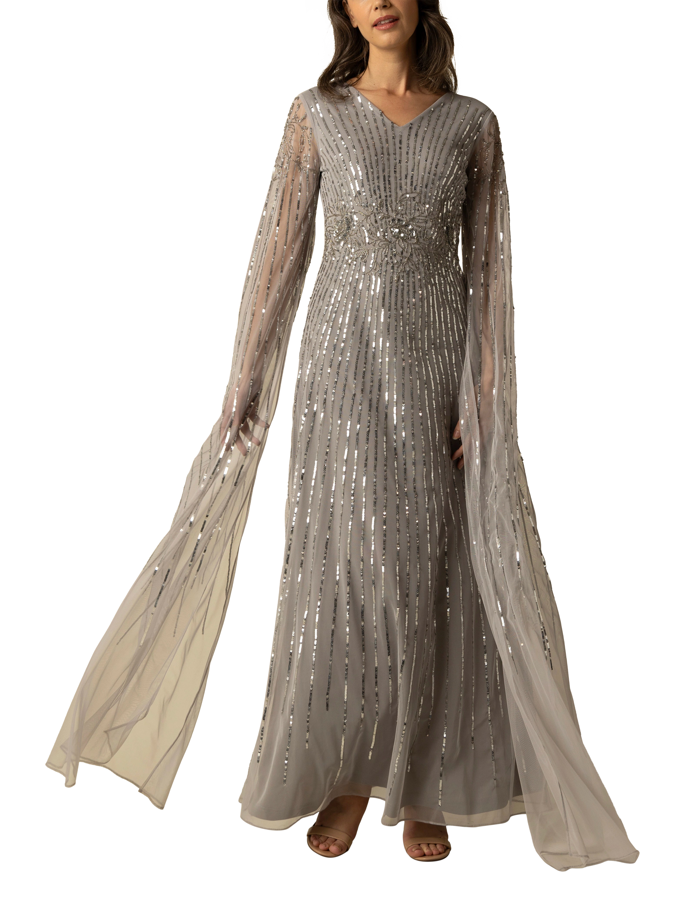 Elevate your evening with the enchanting Peyton Gown, a masterpiece of sophistication. This exquisite dress features a sleek V-neck, long, sheer sleeves, and a flowing skirt that glides effortlessly with every step. Adorned with shimmering sequins, it captures light and attention alike. Perfect for gala events or luxurious weddings, the Peyton Gown promises a dazzling presence.