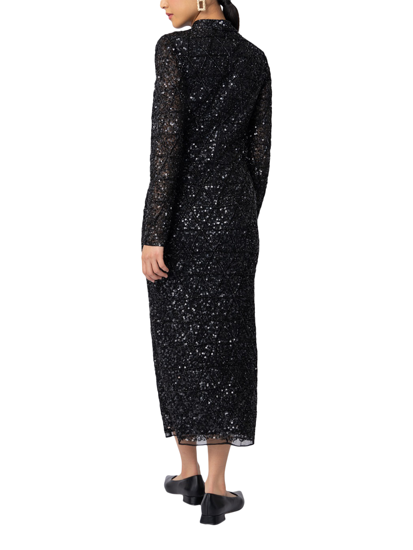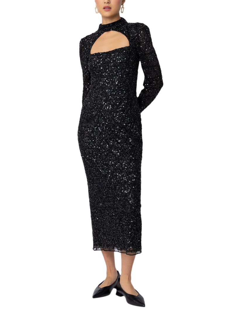 The Phoebe dress is a dazzling midi-length piece, covered in shimmering sequins with a high neckline and long sleeves. Its bold chest cutout and form-fitting silhouette create a perfect balance of elegance and allure. Ideal for upscale events, this dress is a sophisticated choice for making a statement.