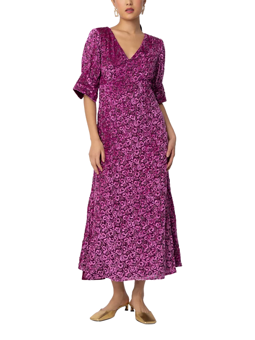 The striking Roxana midi dress features a bold pattern and a flattering V-neckline. With its fitted bodice and 3/4 sleeves, it accentuates the waist for an elegant silhouette.
