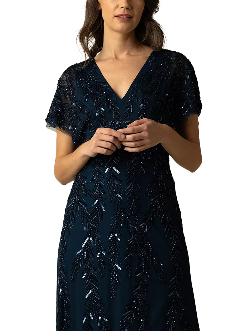 The Serenity Green Gown is a sartorial treasure, perfect for the woman seeking a blend of elegance and allure. This enchanting emerald dress features a wrap-style V-neck and fluttering short sleeves, adorned with a geometric pattern of sparkling sequins that dance in the light. Crafted to contour gracefully, this gown promises a stunning silhouette at any sophisticated event. Choose the Serenity Green Gown for a night where timeless style and contemporary glamour.