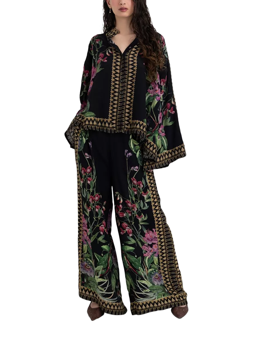 A relaxed-fit tunic-style shirt featuring intricate floral prints. Designed with wide sleeves and ornate border detailing, it blends comfort with effortless elegance.