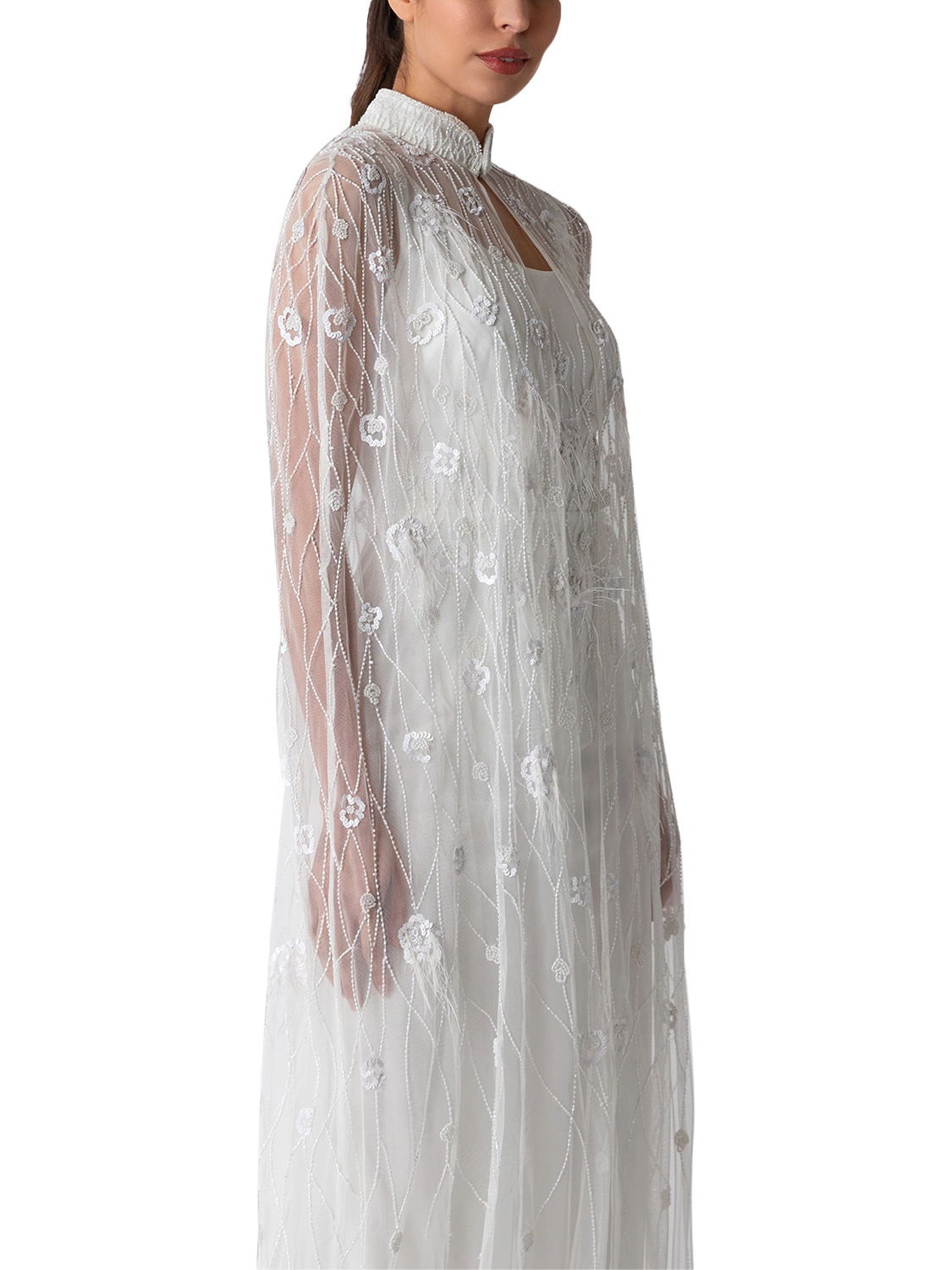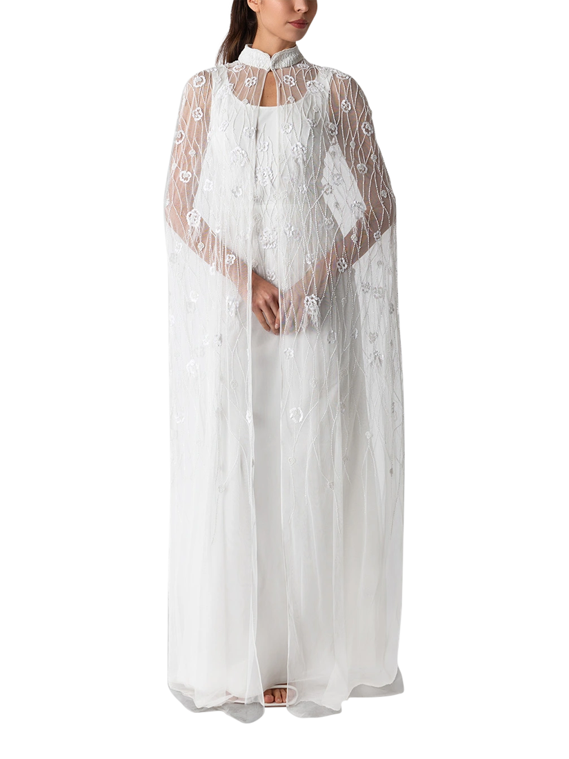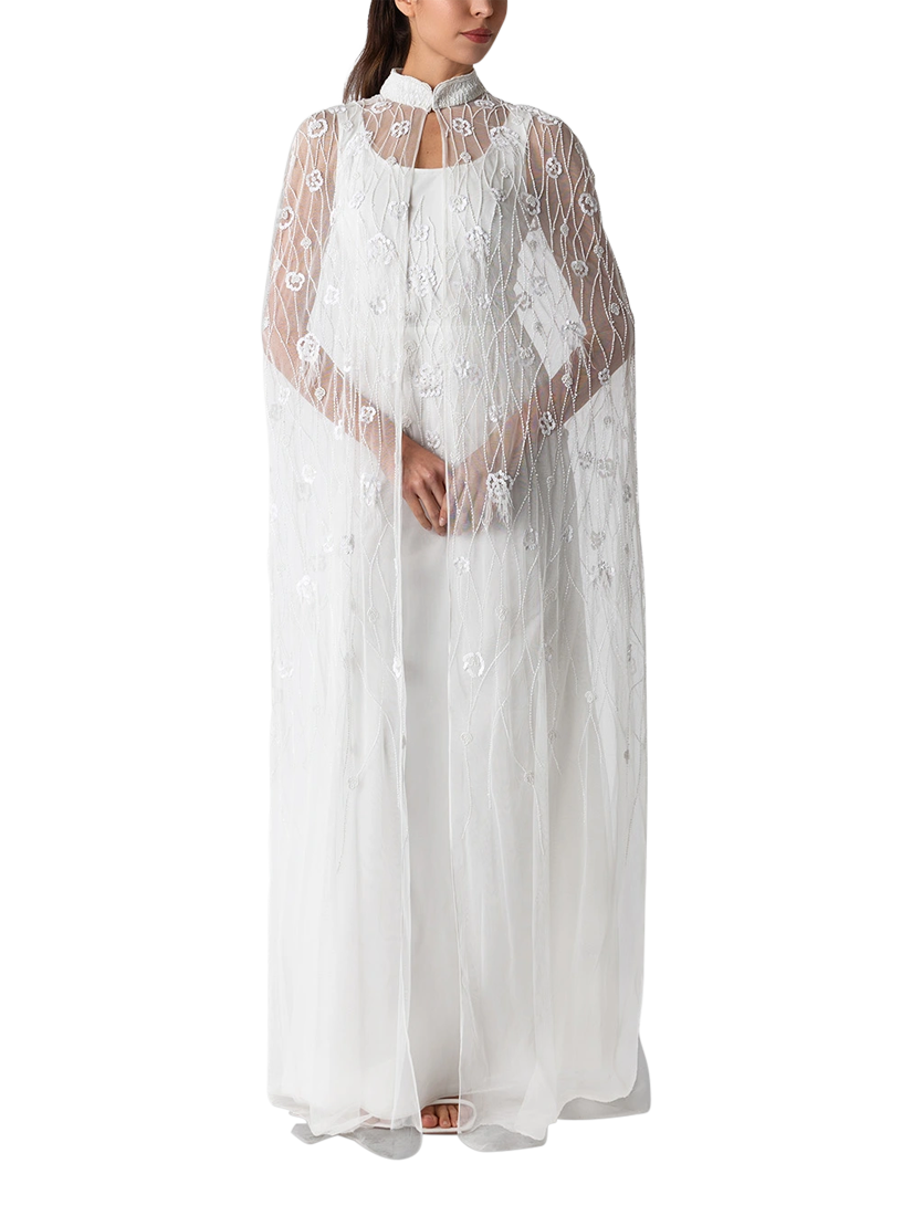 Step into a fairytale with the Sofia Gown, where delicate beading meets ethereal grace. Adorned with crystal embellishments and featuring a sheer, beaded cape, this gown offers a blend of sophistication and fantasy. Its fitted silhouette and soft, flowing skirt make it perfect for weddings or enchanted evenings. The Sofia Gown is where dreams and elegance intertwine.