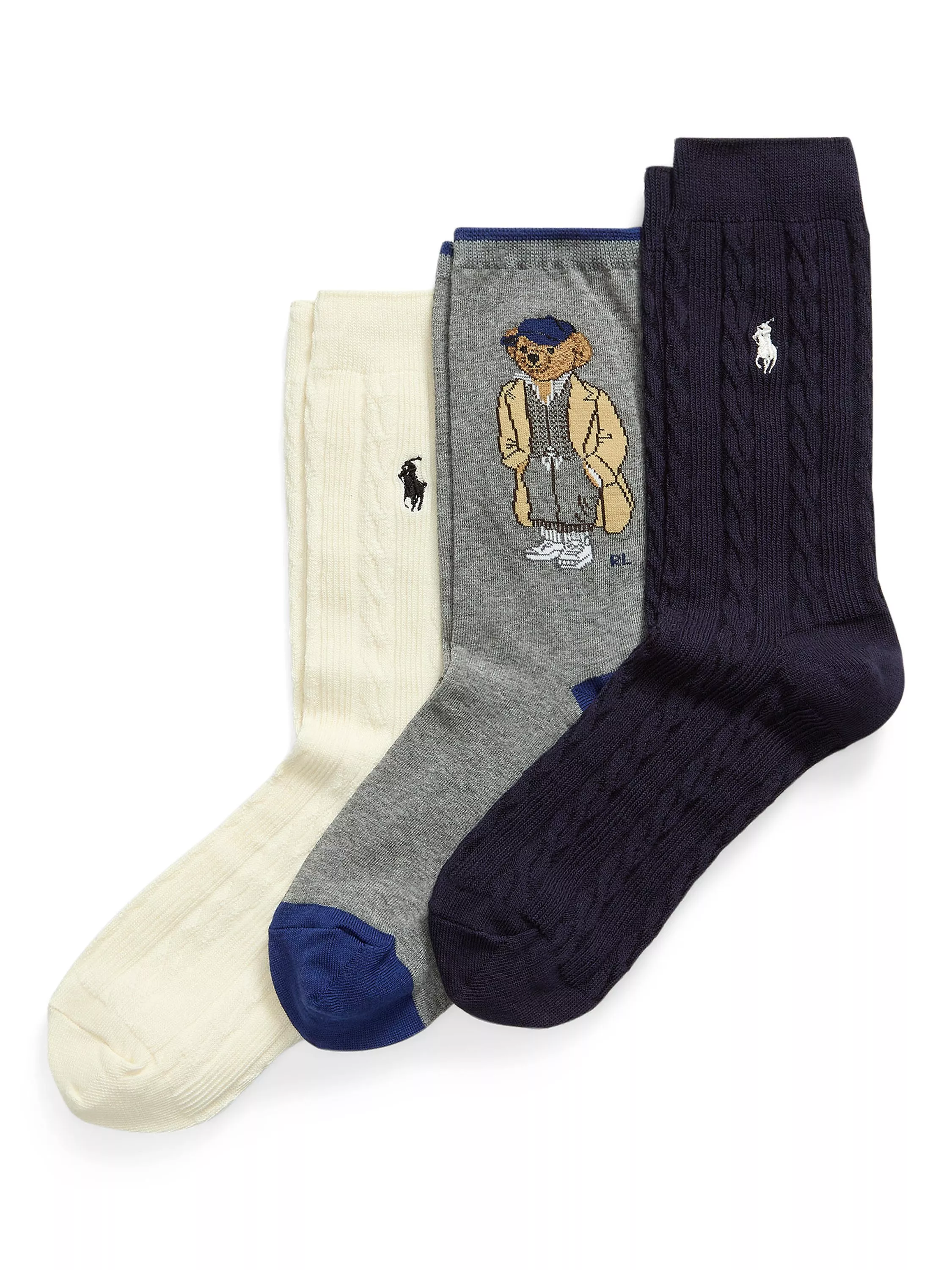 Polo Bear Crew Sock 3-Pack Gift Set. Presented in a signature gift box, this soft cotton-blend set includes three pairs of crew socks: one featuring the Polo Bear and two cable-knit pairs with signature embroidered Pony on the outer sides.