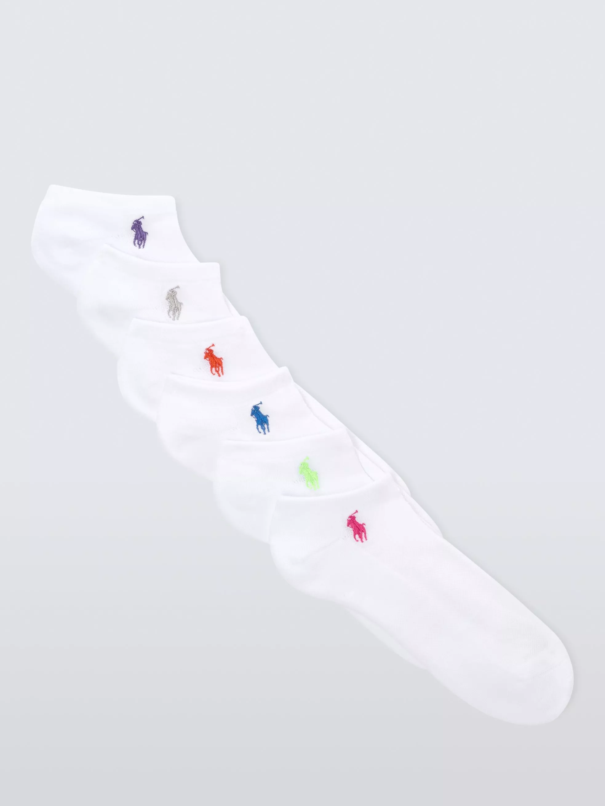 Each pair in this six-pack of cotton-blend ankle socks is enhanced with stretch for a comfortable fit and finished with the Ralph Lauren signature embroidered Pony.