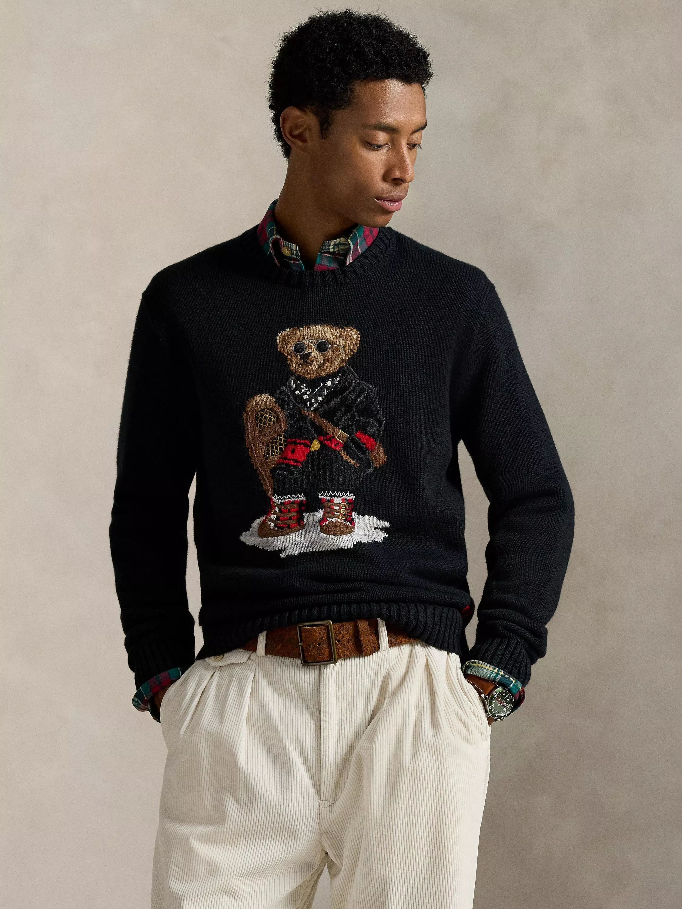 Developed with over 15 yarns, this sweater features the beloved Polo Bear in a stylish outfit holding vintage-style snowshoes. Considered details include real corozo buttons on the bear’s coat and Ralph Lauren initials hand-embroidered at the hem.