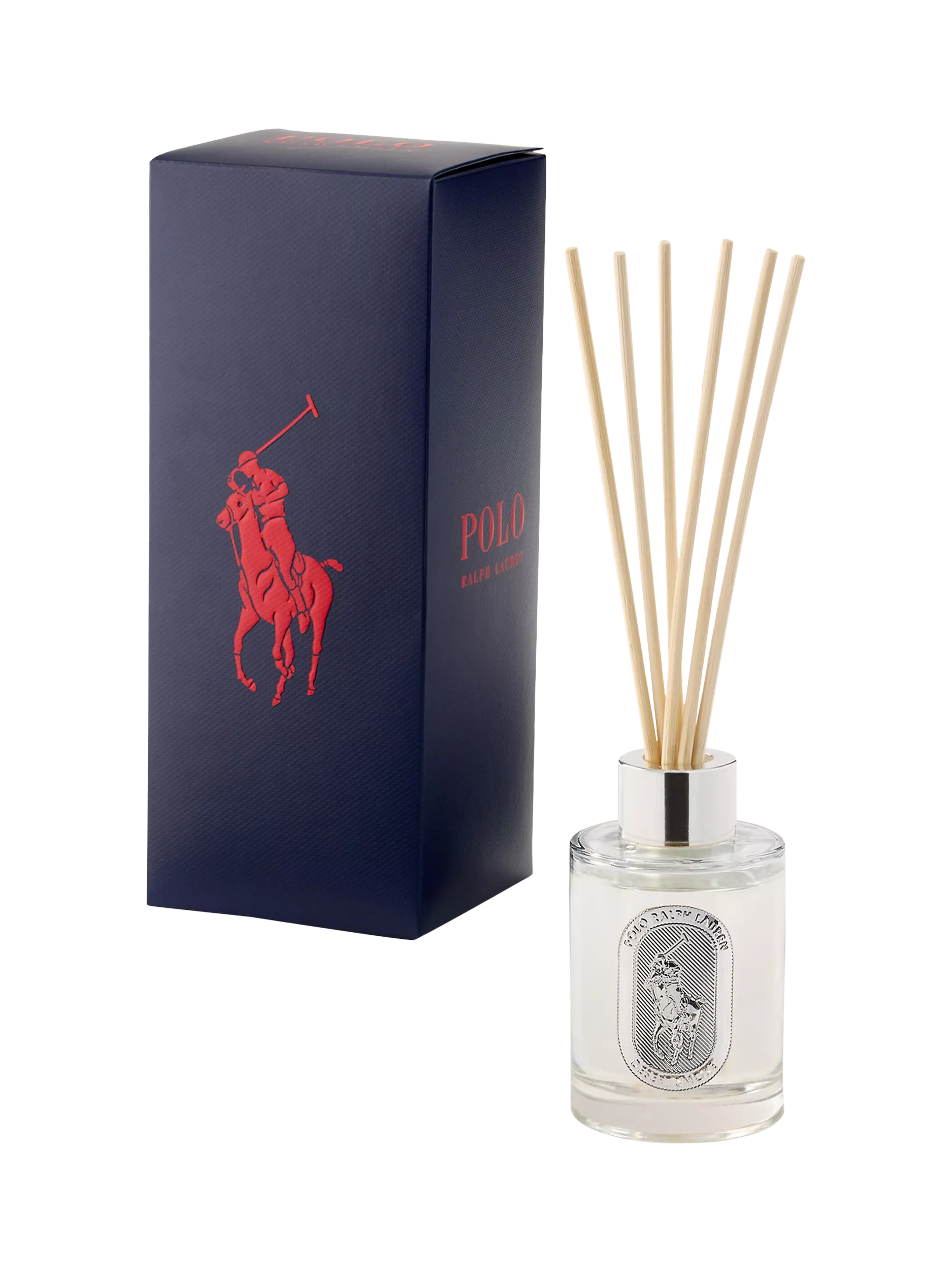 The Desert Smoke diffuser is scented with notes of mint, palo santo, and patchouli. The glass vessel is detailed with a metal emblem featuring Ralph Lauren's signature Pony and logo. Includes five wooden reed sticks.
