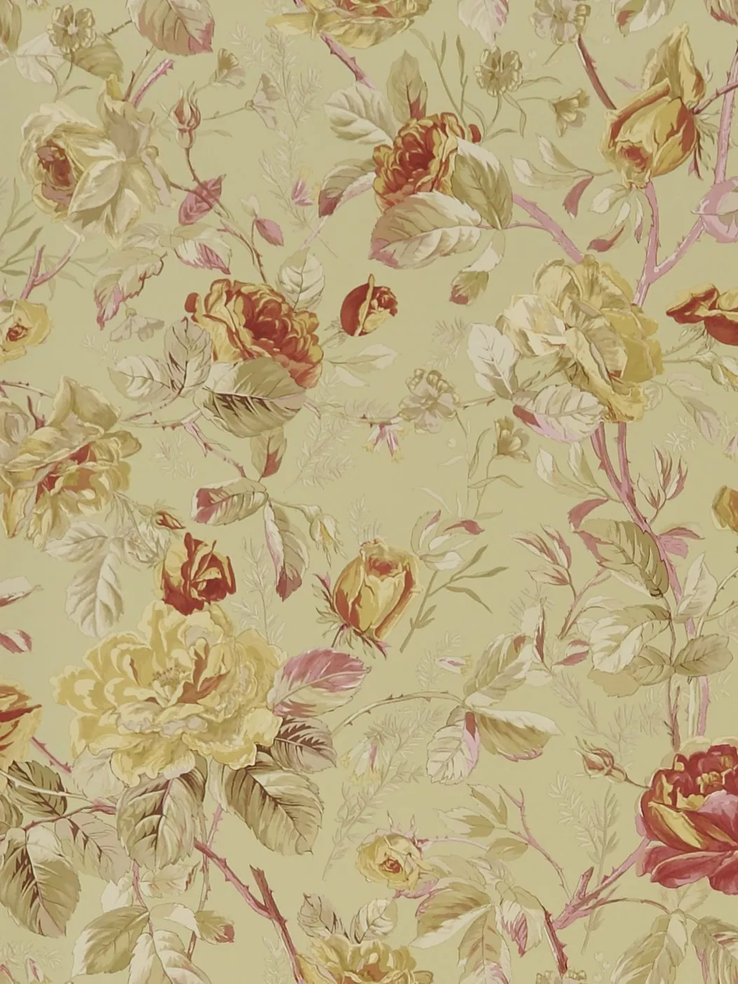This trailing rose and leaf wallpaper pattern perfectly captures the spirit of an English country garden in full bloom.