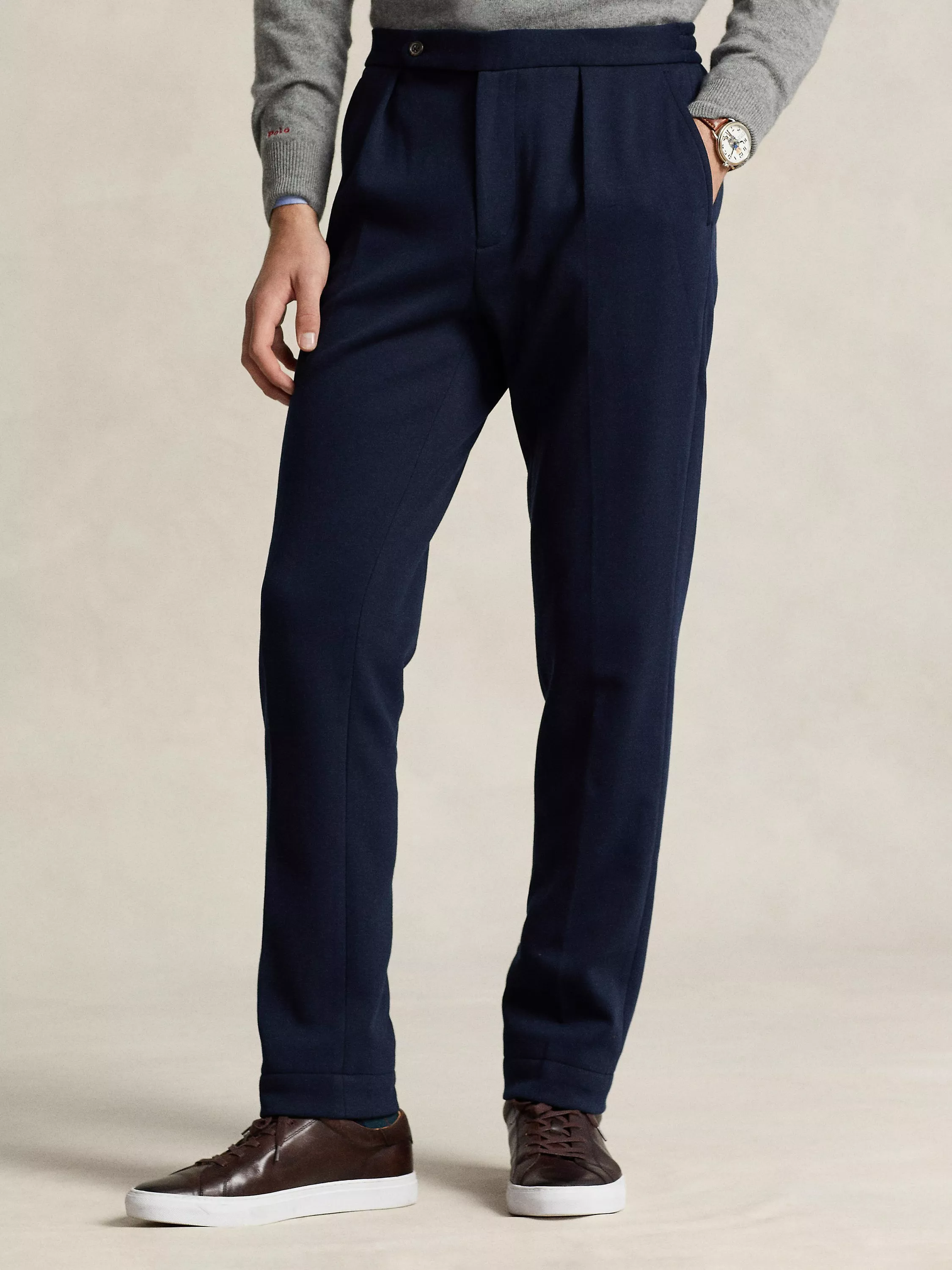 Pleated suit trousers from Ralph Lauren, a modern take on tailoring crafted from a smooth double-knit cotton-blend fabric. Finished with an elastic drawstring waist.