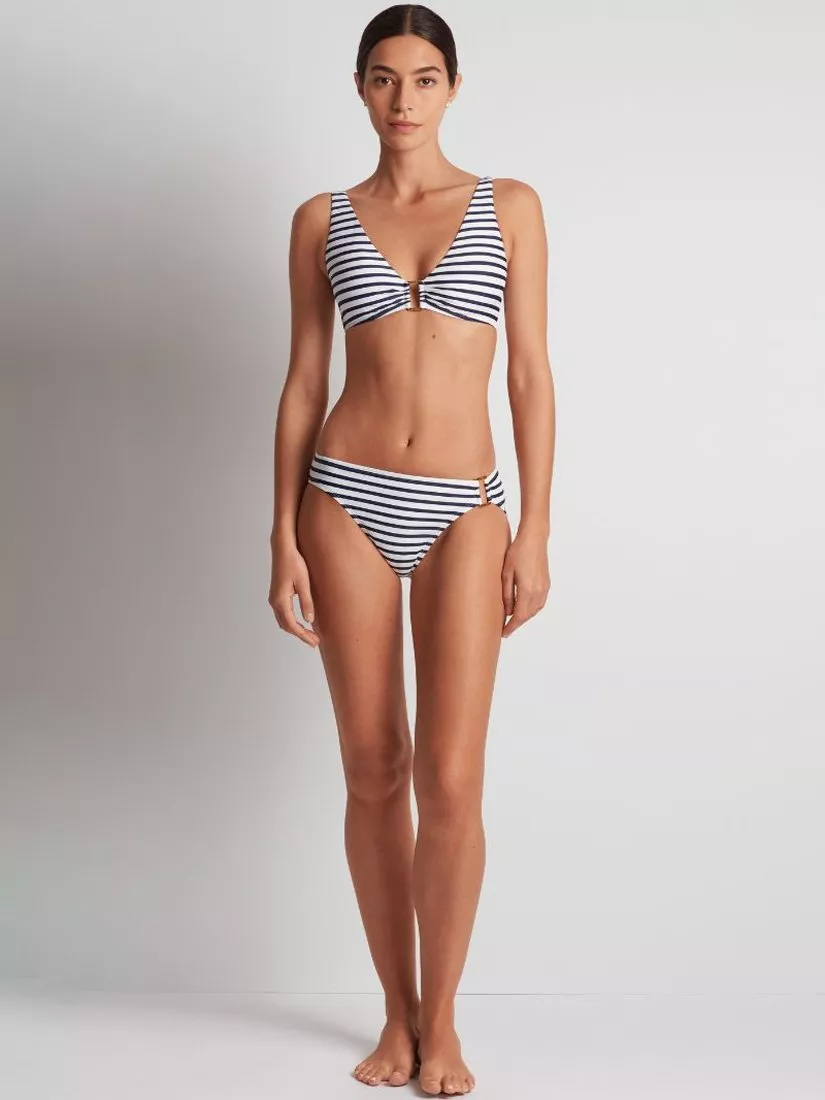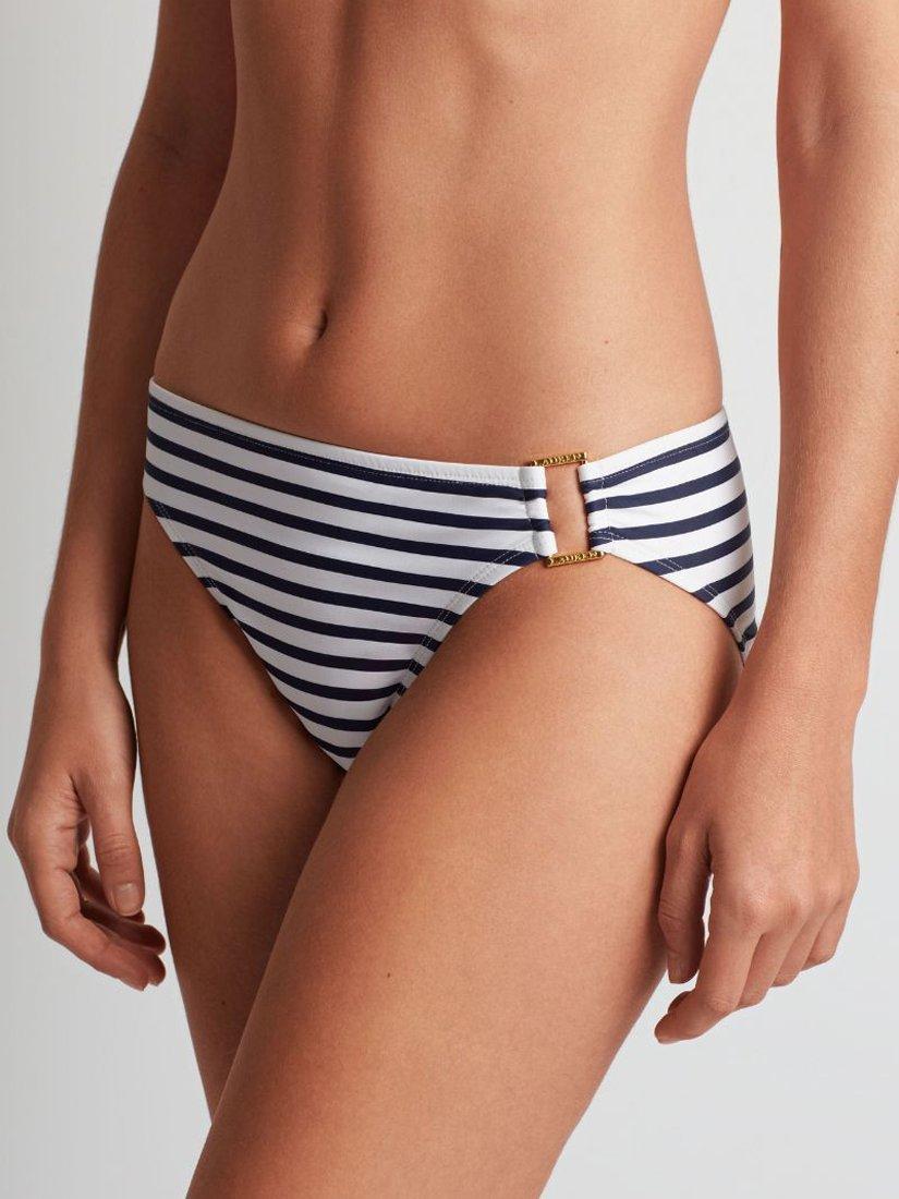 Lauren Ralph Lauren inspires this firm favourite ring side bikini bottom with a classic Ralph Lauren nautical luxe stripe, offering modern coverage with a modern leg. The gold hardware on this bikini is logo embroidered.