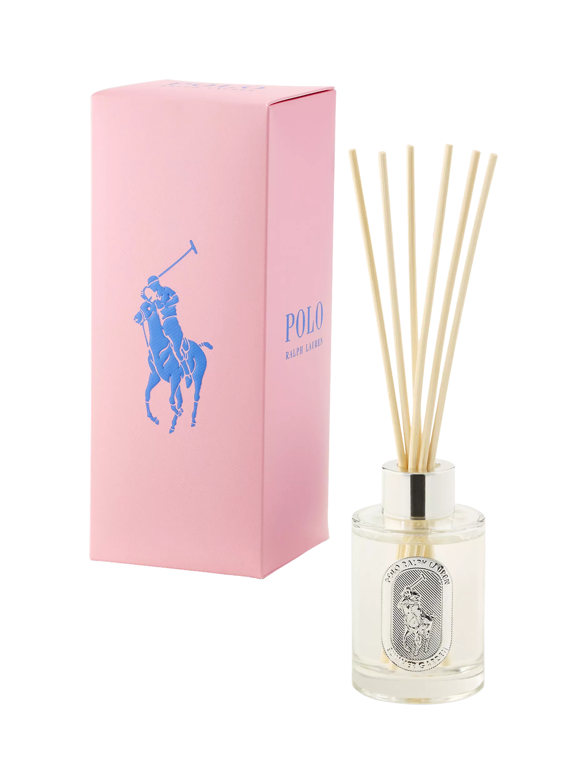The Summer Garden diffuser is scented with notes of yuzu, sage, and thyme. The glass vessel is detailed with a metal emblem featuring Ralph Lauren's signature Pony and logo. Includes five wooden reed sticks.