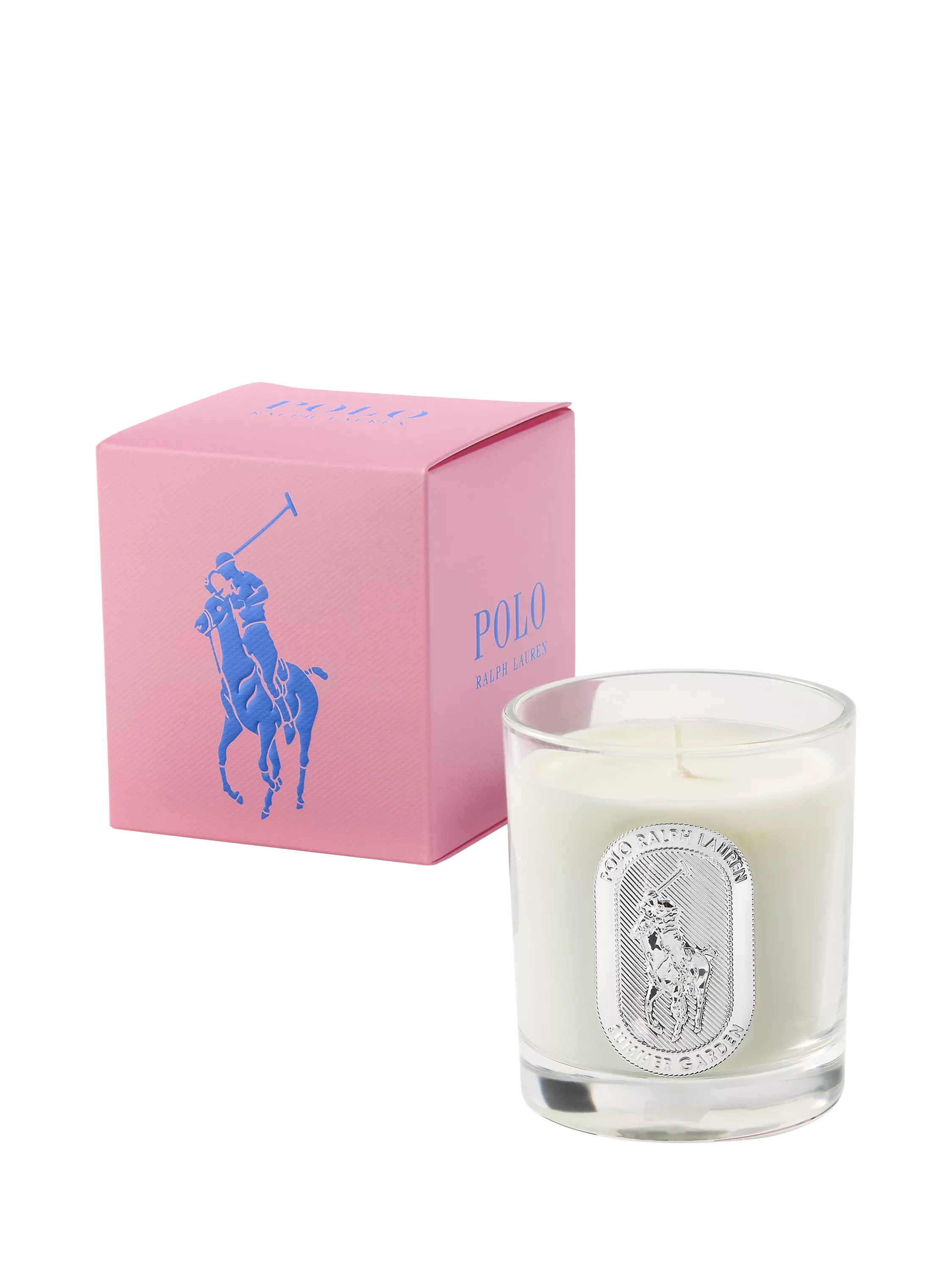 The Summer Garden candle is scented with notes of yuzu, sage, and thyme. The glass vessel is detailed with a metal emblem featuring Ralph Lauren's signature Pony and logo.