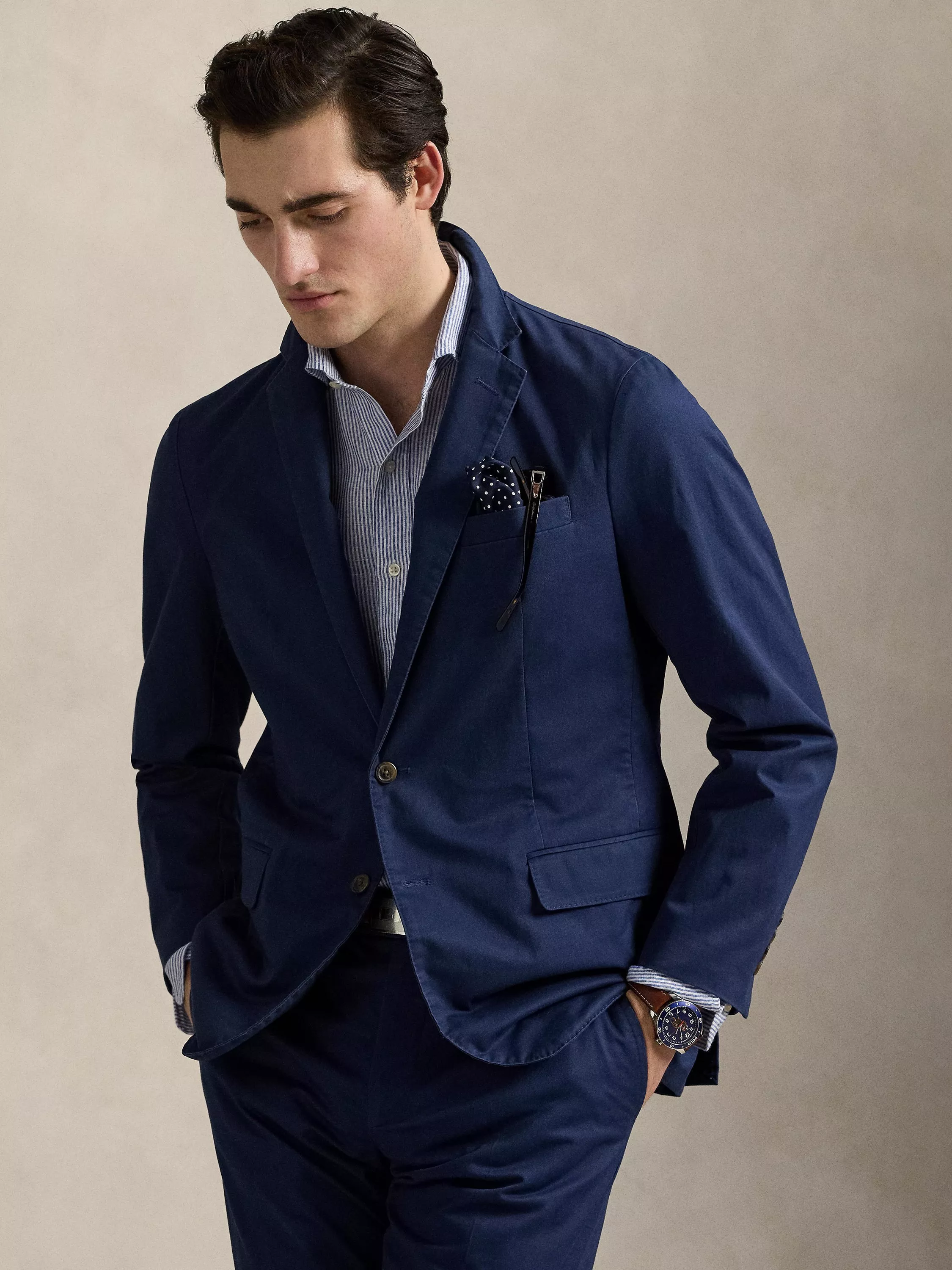 This Ralph Lauren blazer puts a modern spin on classic preppy style with a natural shoulder and light weight. This version is crafted from a custom-developed chino fabric that was woven with extra stretch for added comfort. A special wash combined with a peached process also imparts extraordinary softness along with a lightly broken-in appearance.