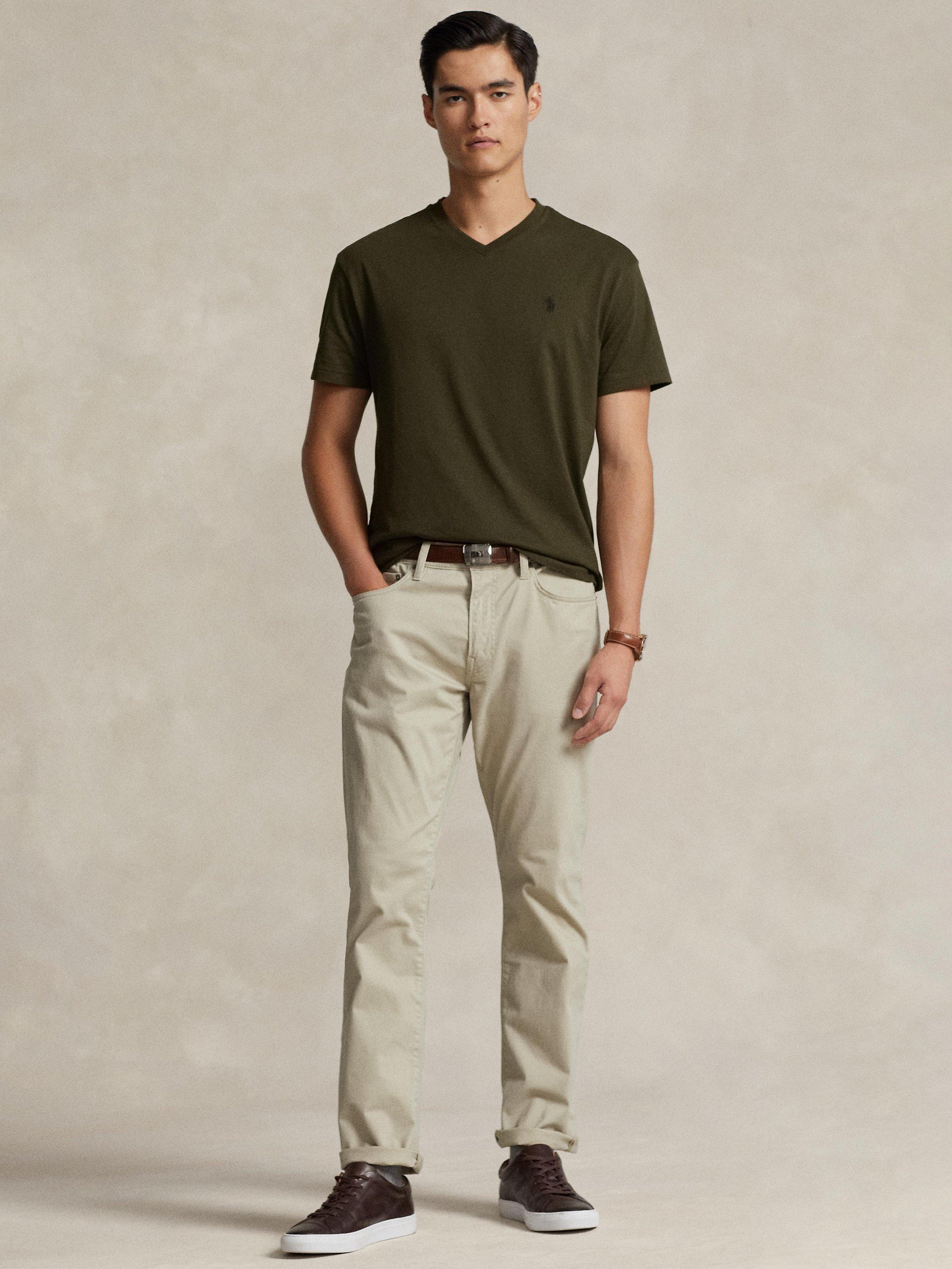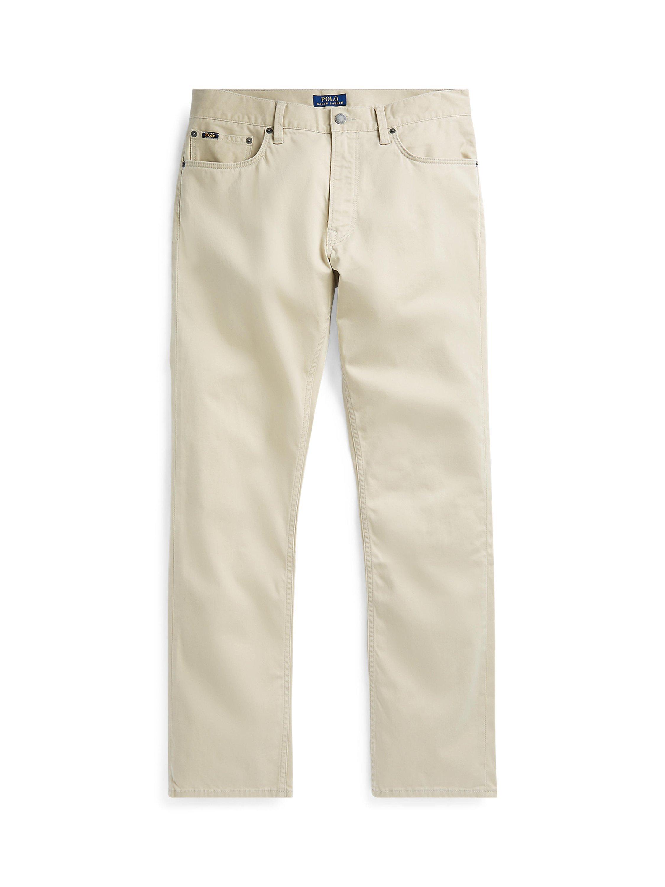 The Varick style from Ralph Lauren features a straight leg that is fitted through the thigh and relaxed from the knee down. This version is made with soft, stretch-friendly cotton and finished with metal rivets, as well as a classic leather logo patch at the waistline.