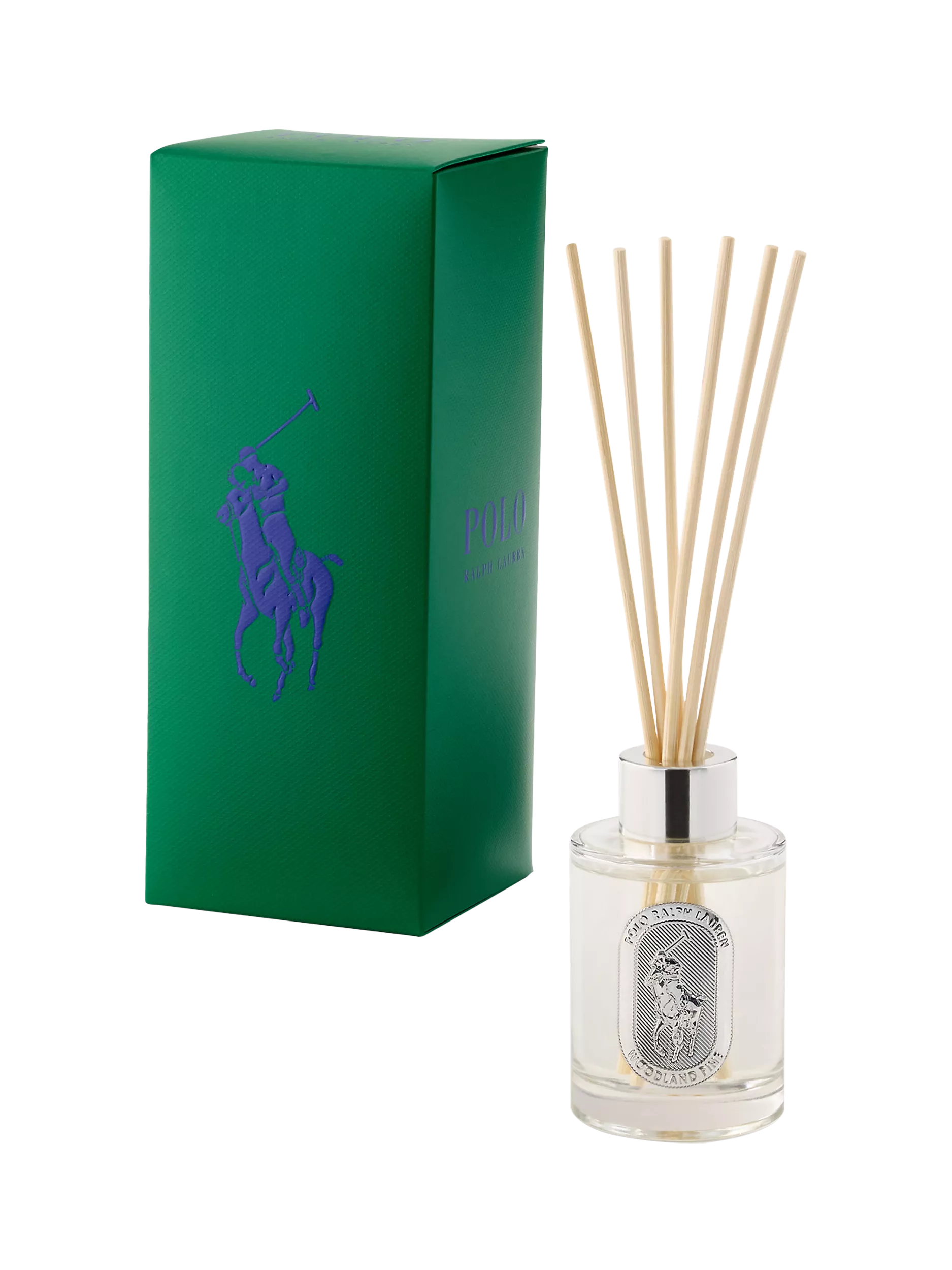 The Woodland Pine diffuser is scented with notes of pine, clover, and vetiver. The glass vessel is detailed with a metal emblem featuring Ralph Lauren's signature Pony and logo. Includes five wooden reed sticks.