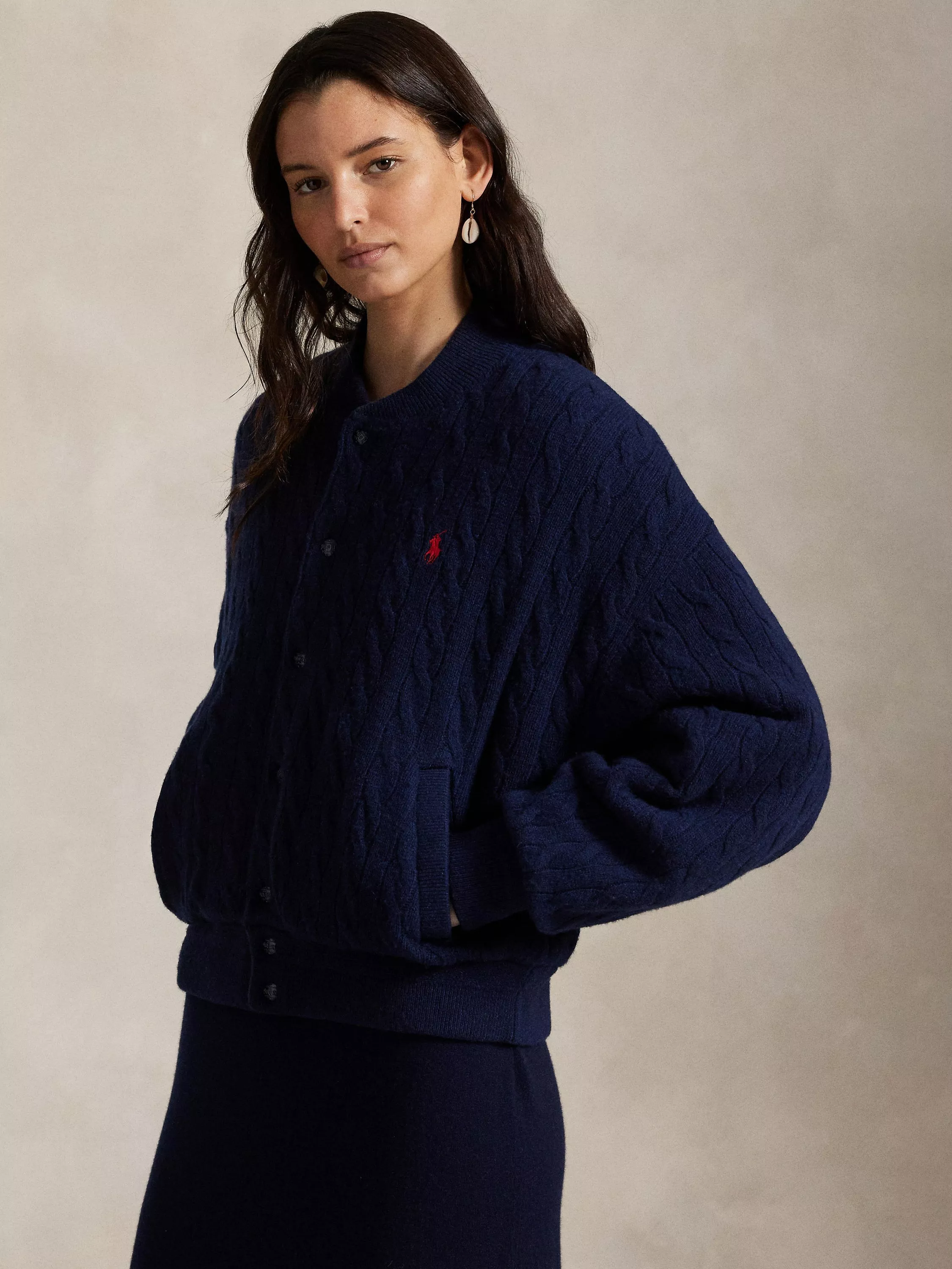 A classic cable-knit bomber jacket from Ralph Lauren, featuring a ribbed collar, press-stud fastening and side pockets. Crafted from a wool-cashmere blend and cut to a relaxed fit.