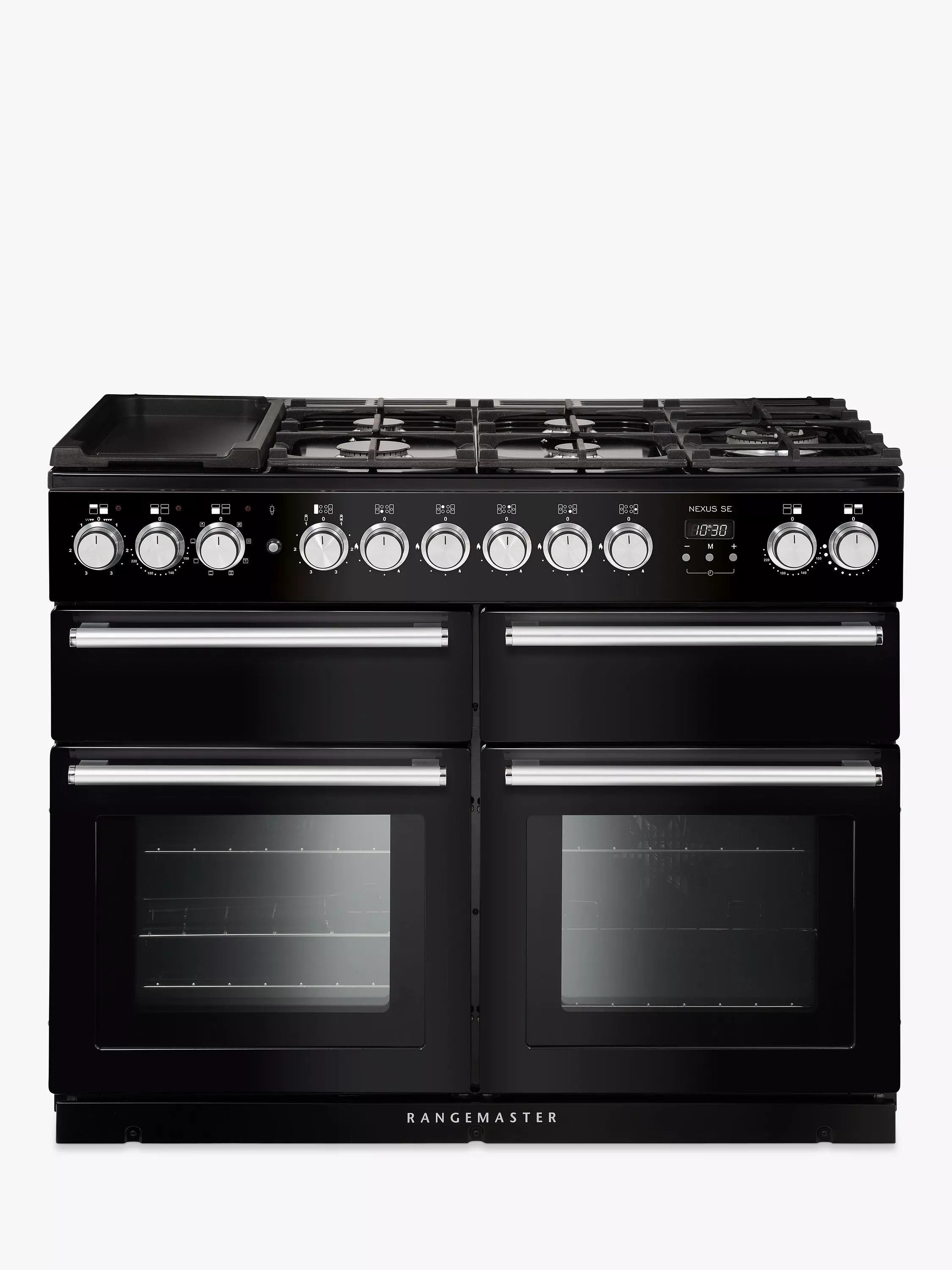 A serious cook’s cooker available in a selection of contemporary colours. Combining state of the art new technology from Rangemaster with their unmistakable style, it features a gas hob with a range of burner sizes, ultra-modern diamond turned rotary control knobs and chrome tubular handles, and new white light display.