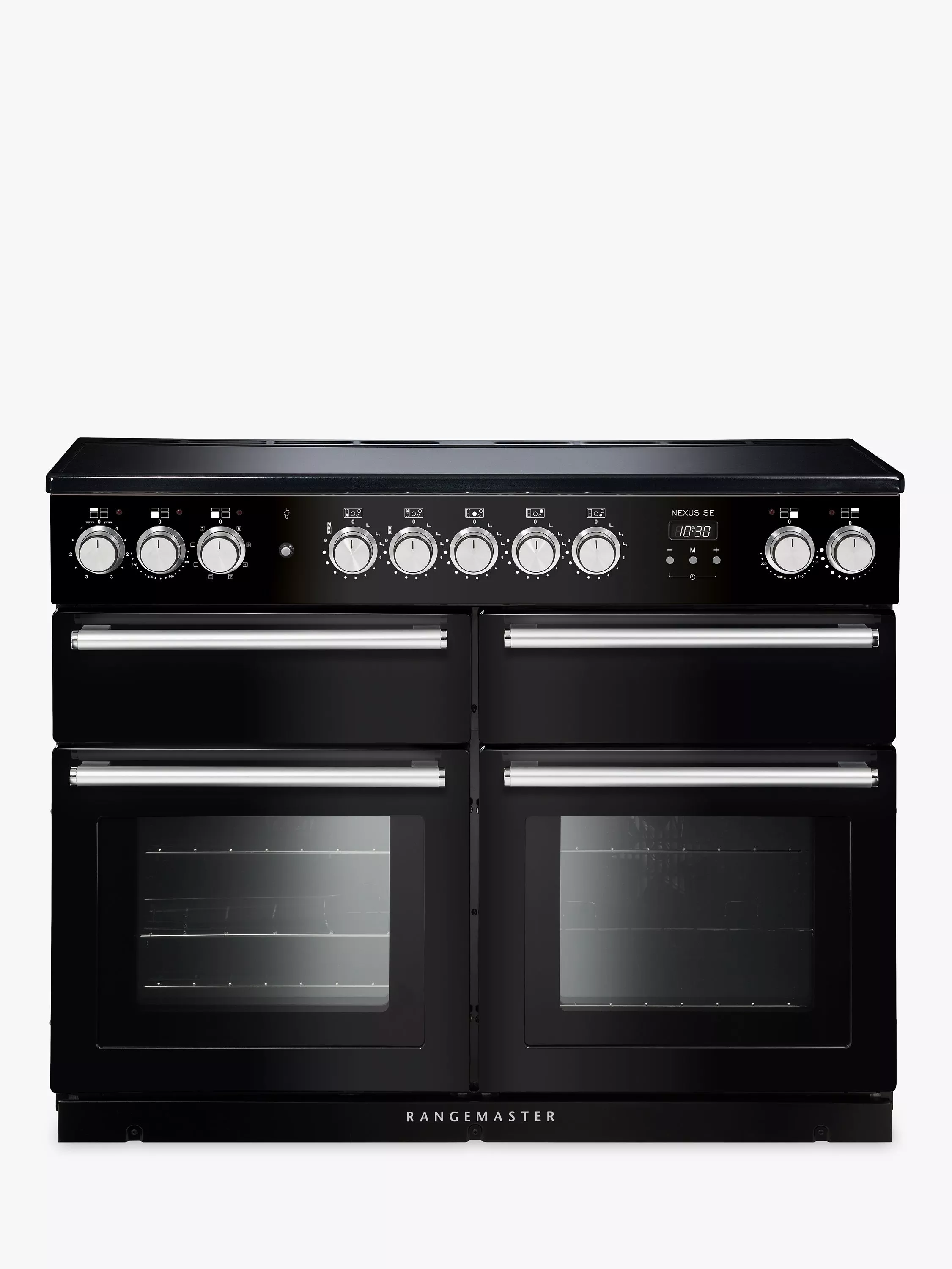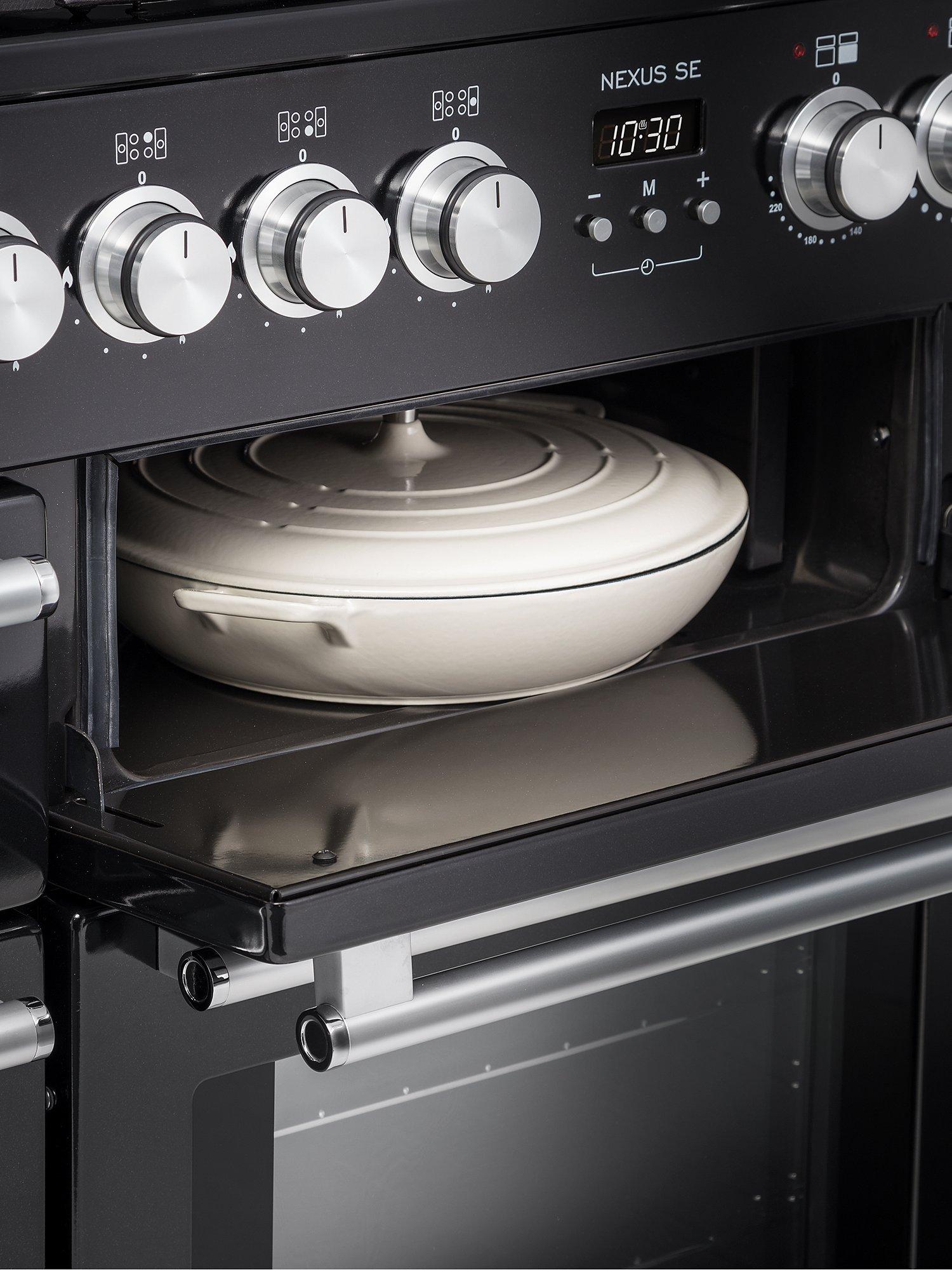 A serious cook’s cooker available in a selection of contemporary colours. Combining state of the art new technology from Rangemaster with their unmistakable style, it features a modern induction hob, ultra-modern diamond turned rotary control knobs and chrome tubular handles, and new white light display.
