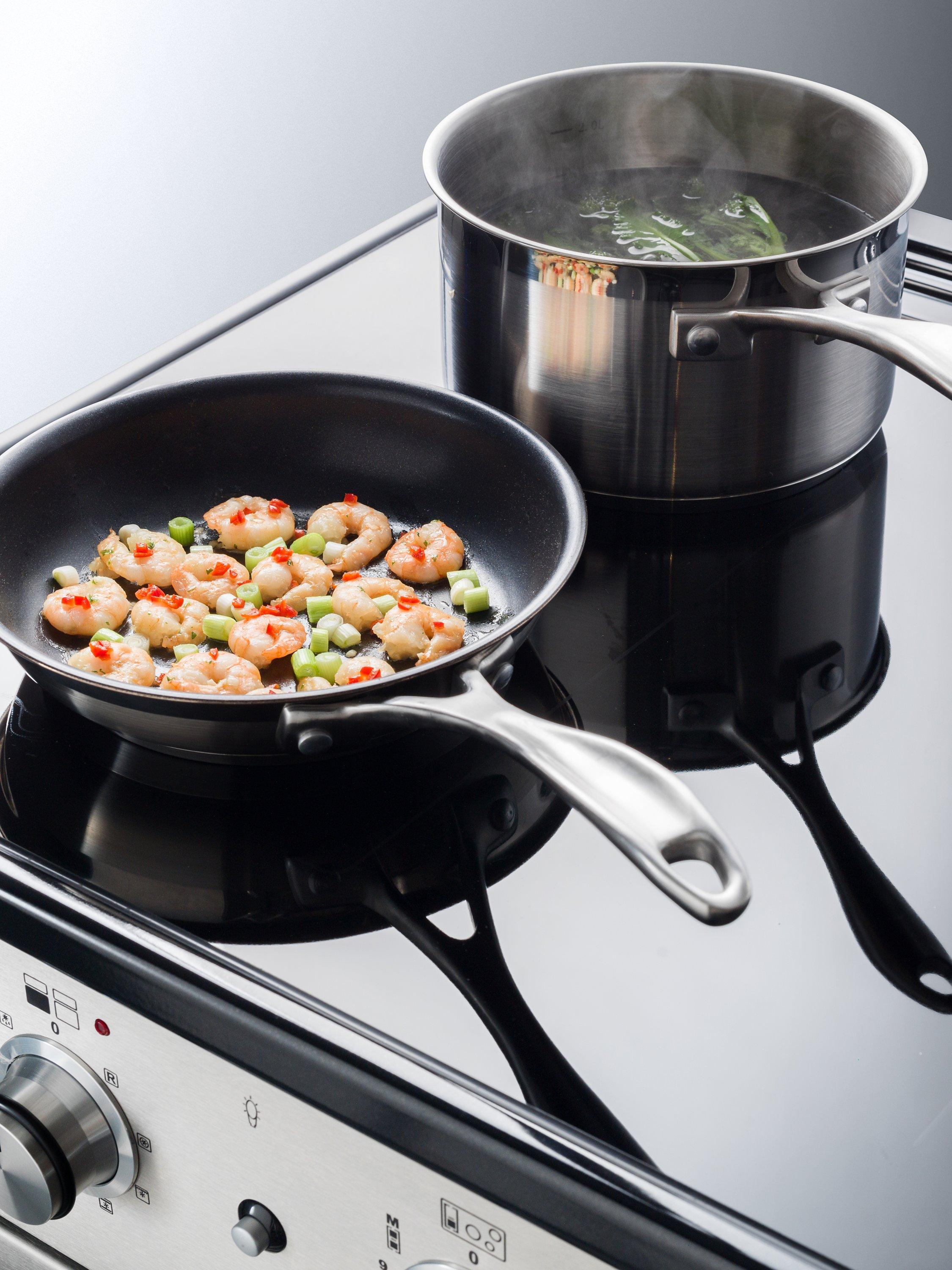 Employing Rangemaster's new G5 MK2 induction hob, featuring five main hob sections, with two left left zones that can be operated together to create a bridged zone for large pans or a griddle. Low temperature settings will hold the zones at your desired temperature for up two hours, after which they will automatically switch off if left untouched. Use with any induction compatible hobs.