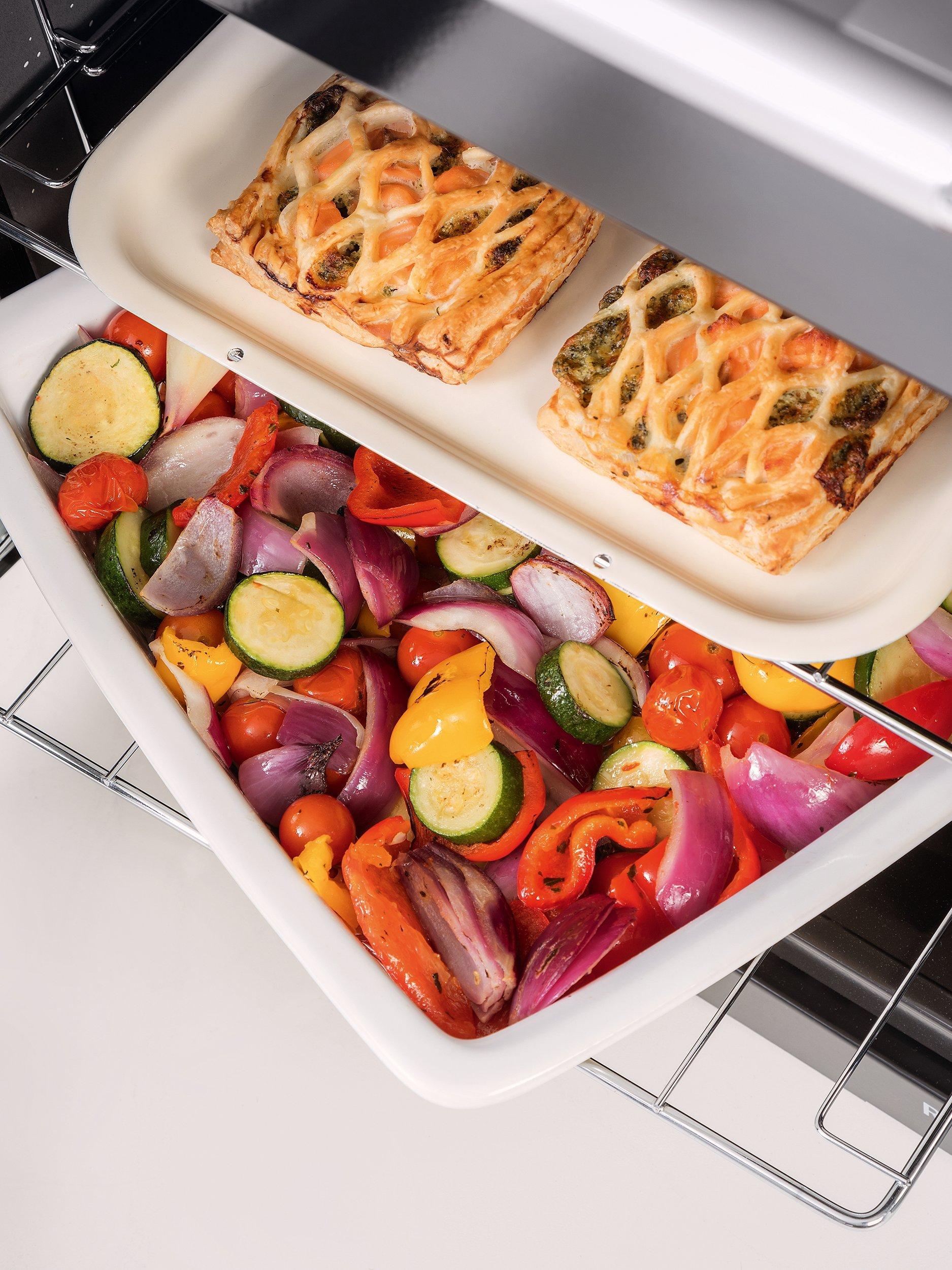 There's a separate dual circuit grill where the grill pan glides out on runners for extra convenience, and sturdy Catch-rite door fixtures. On the right is a dedicated slow cooker cavity, perfect for tender roasts and stews. Catalytic stay-clean liners make maintenance easy, absorbing fat and steam during the cooking process and releasing them to the base of the cavity to be simply wiped away.