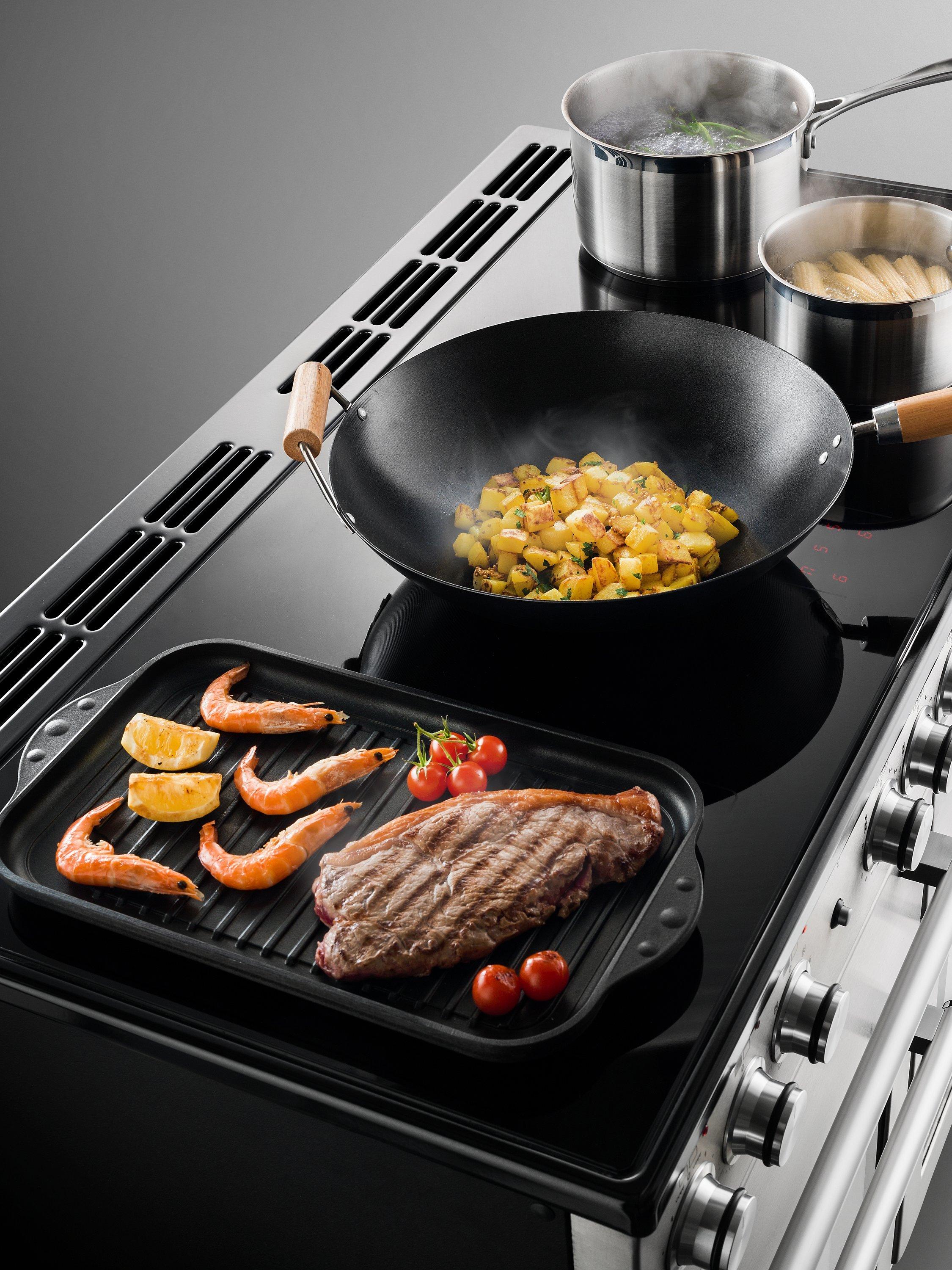 Employing Rangemaster's new G5 MK2 induction hob, featuring five main hob sections, with two left left zones that can be operated together to create a bridged zone for large pans or a griddle. Low temperature settings will hold the zones at your desired temperature for up two hours, after which they will automatically switch off if left untouched. Use with any induction compatible hobs.