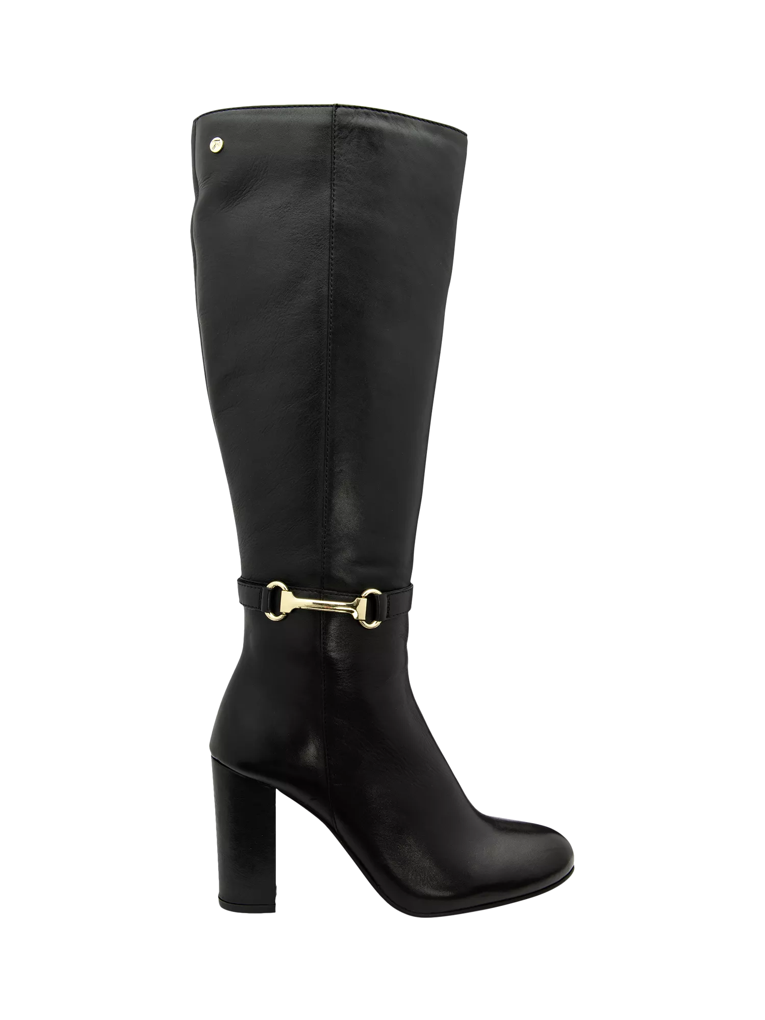This knee-high boot features a a striking horse bit detail just above the ankle and is boosted by a block heel. It is also made from high-quality leather.
