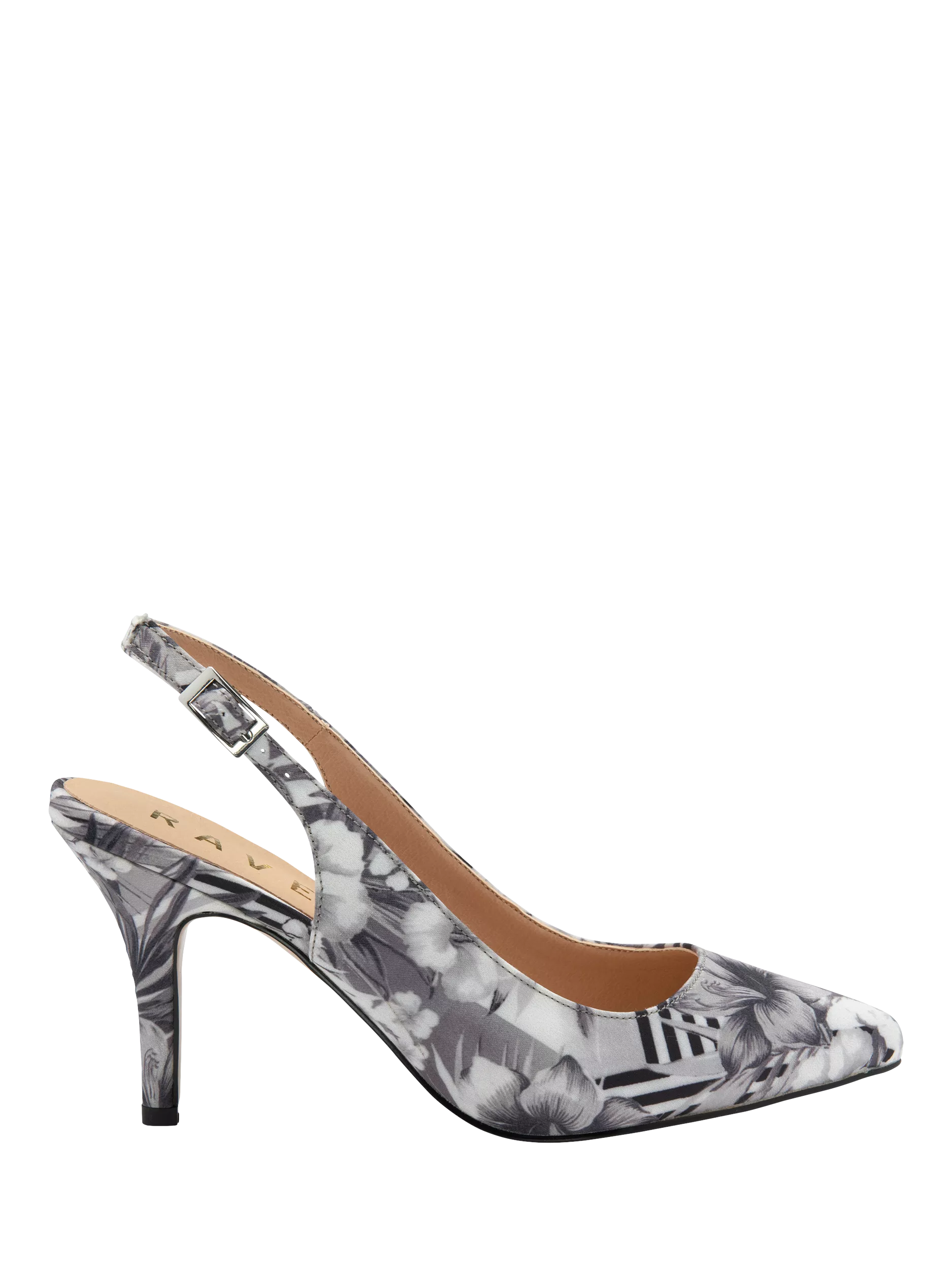 A stylish choice for formal occasions, this pair of heeled courts from Ravel sit on a stiletto heel with a pointed toe and an adjustable slingback.