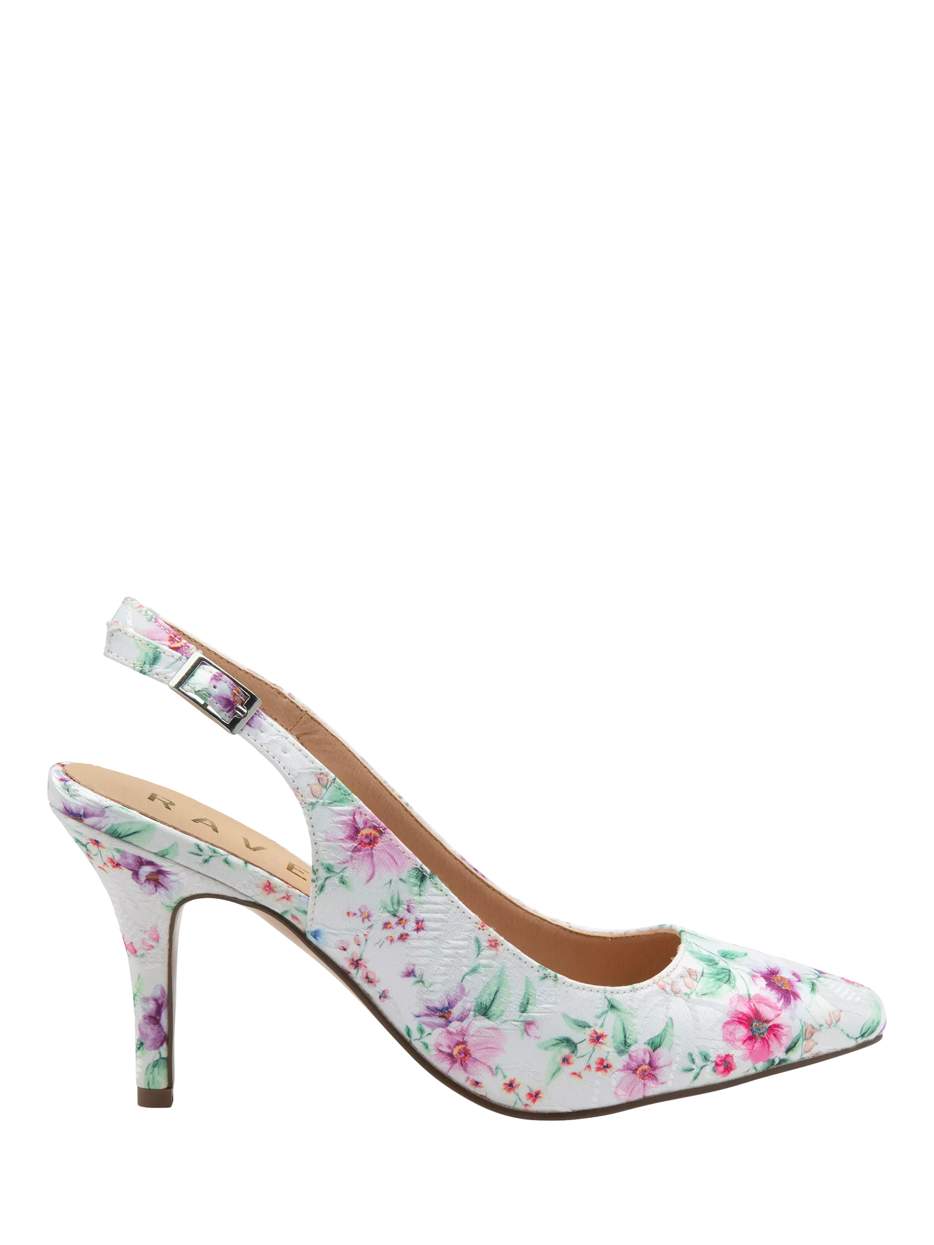 A stylish choice for formal occasions, this pair of heeled courts from Ravel sit on a stiletto heel with a pointed toe and an adjustable slingback.