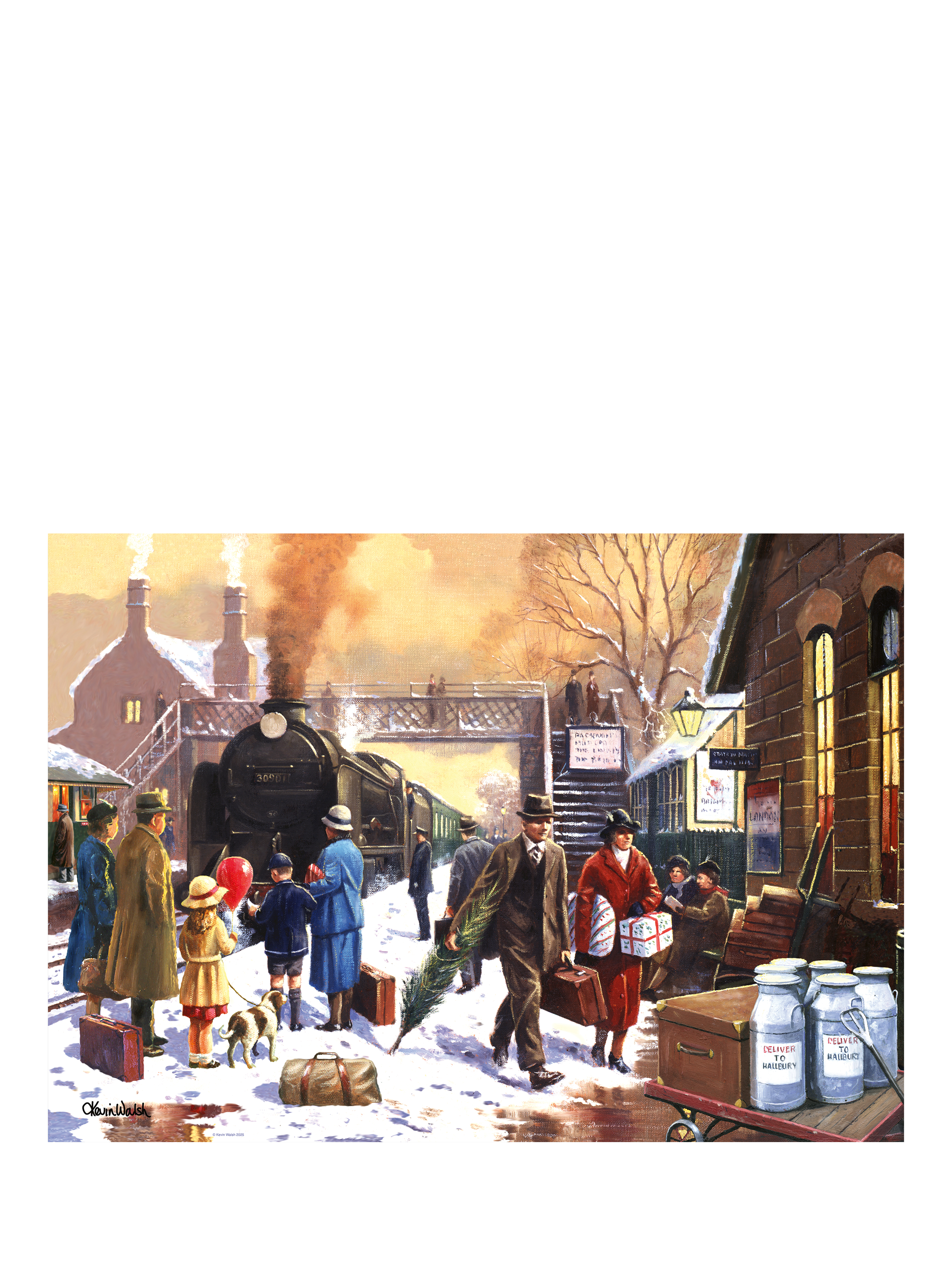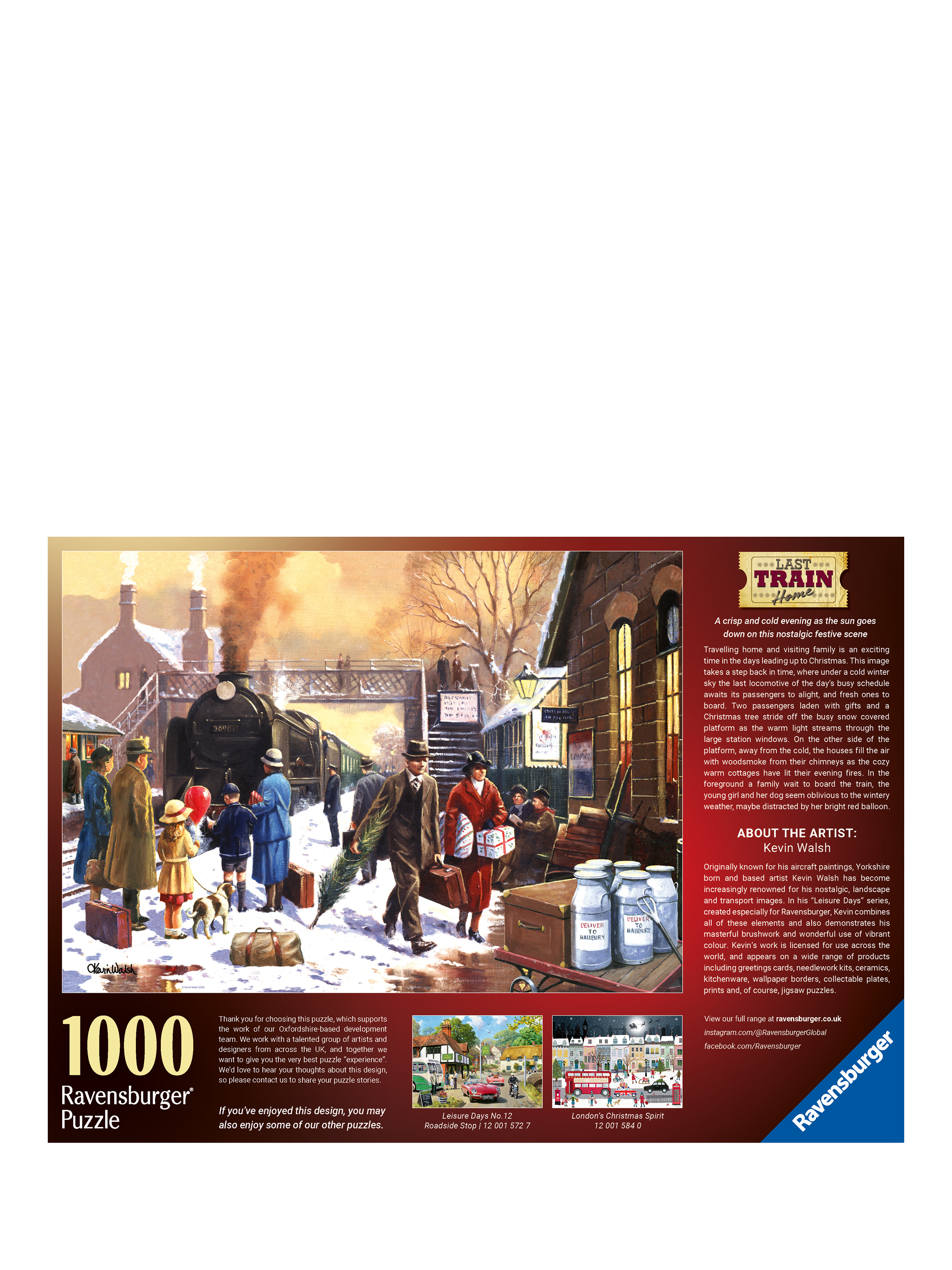 Relive the nostalgic charm of a wintery evening with this beautiful 1000-piece jigsaw puzzle. The scene captures a snowy countryside train station, where the final train of the day pulls in amidst a peaceful blanket of snow. Excited children, bundled in coats and scarves as they eagerly await their loved ones returning home. The soft fall of snowflakes create a magical, cozy atmosphere. As you assemble this heartwarming puzzle, you'll experience the timeless joy of a winter's evening and the anticipation of reuniting with family.