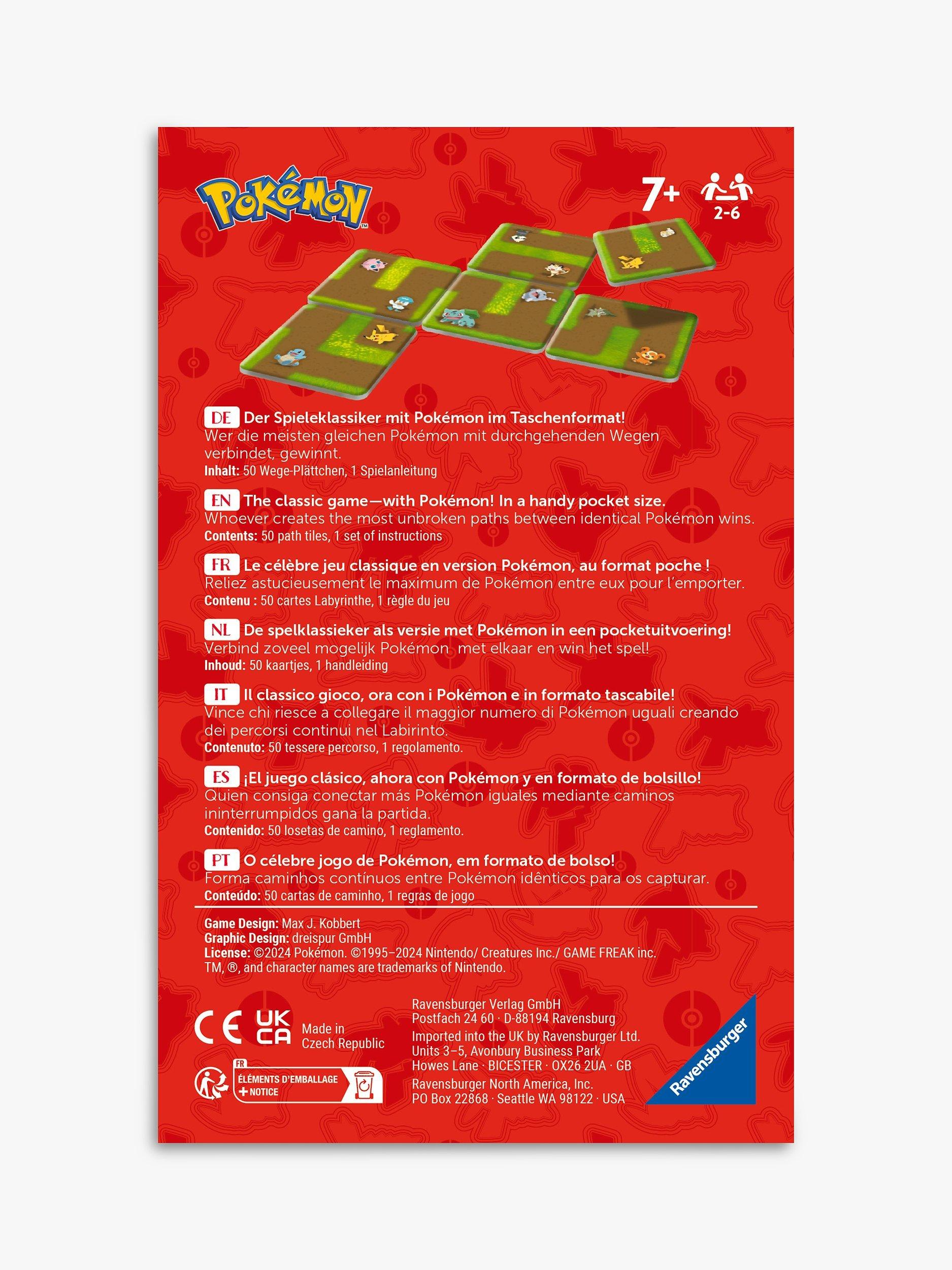 The classic game in pocket size! 2 to 6 Pokémon fans aged 7 and over place square path tiles to create a constantly changing maze! The aim is to connect identical Pokémon with continuous paths. If you manage to do this, you win the path tile that is already in the maze. Which Pokémon fan will have collected the most path tiles and thus Pikachu, Bisasam, Glumanda, Schiggy and many more in this handy placement game?