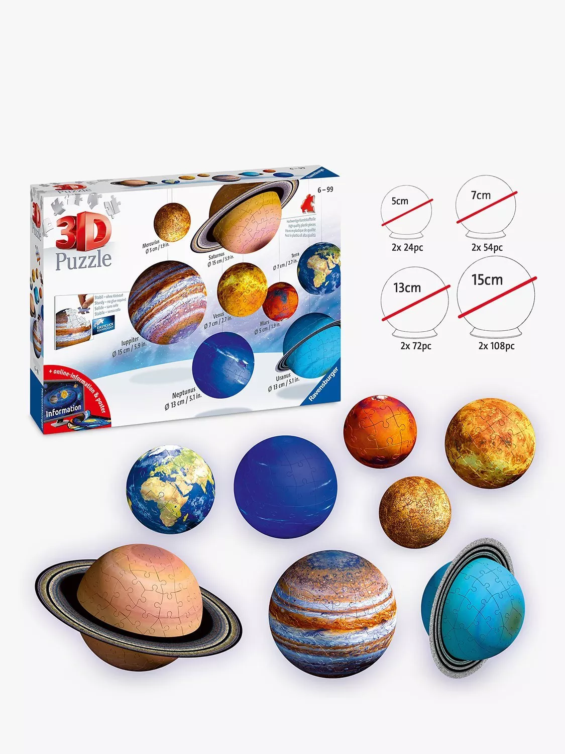 The 3D puzzles are scaled to represent the different sizes of the planets, so Saturn and Jupiter are represented as 108pc puzzles, Uranus and Neptune as 72pc, Earth and Venus as 54pc and Mars and Mercury as 27pc puzzles, totalling 522 pieces in all.