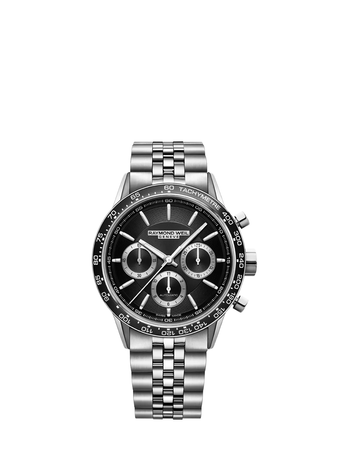 Raymond WeilMen's Freelancer 43.5 Chronograph Automatic Bracelet Strap Watch, Silver