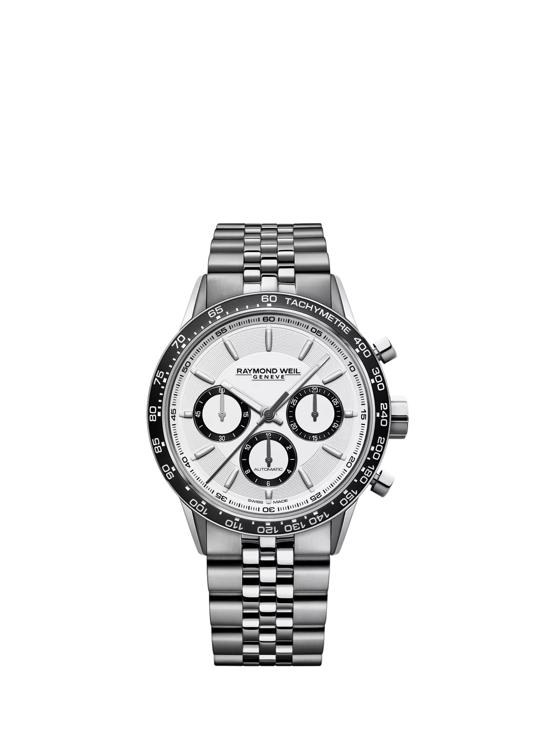 Raymond WeilMen's Freelancer 7741 Chronograph Automatic Bracelet Strap Watch, Silver/White