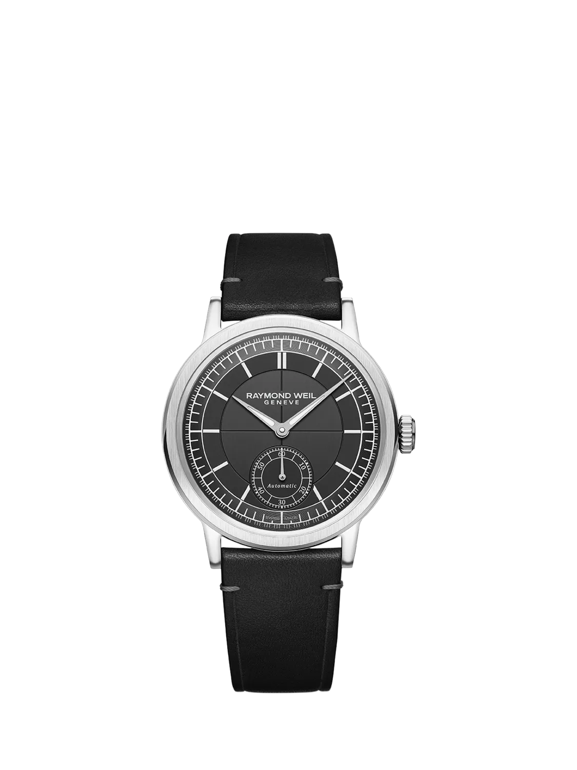 Raymond WeilMen's Millesime 39.5 Seconds Dial Automatic Leather Strap Watch, Silver/Black