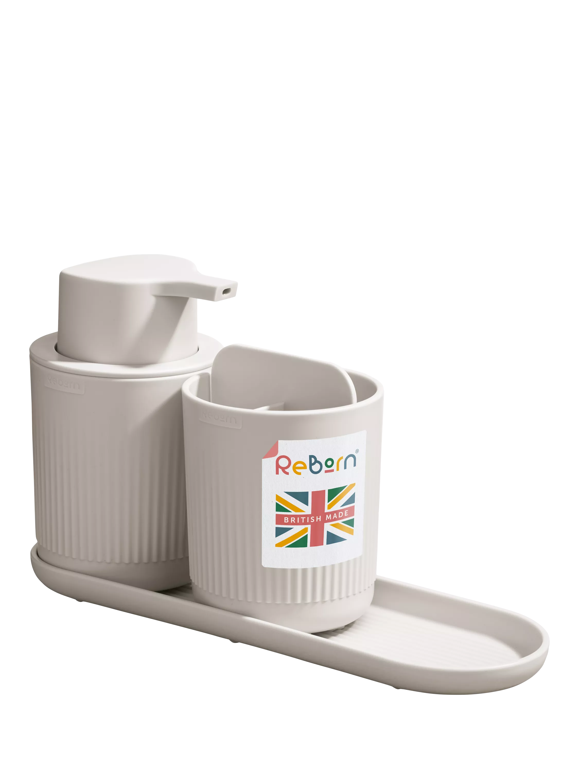 Contains a ReBorn soap dispenser, (easy one handed use and refillable), a toothbrush caddy with three compartments and a large storage tray with raised air flow drying ribs.