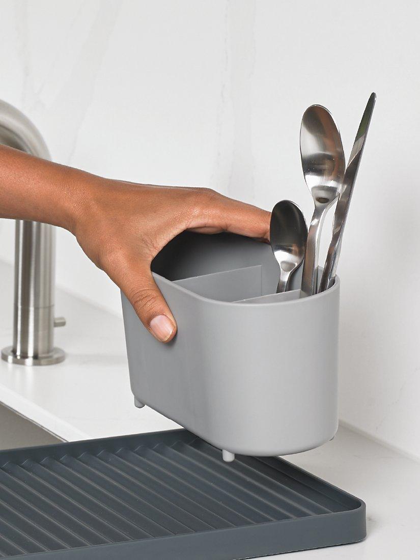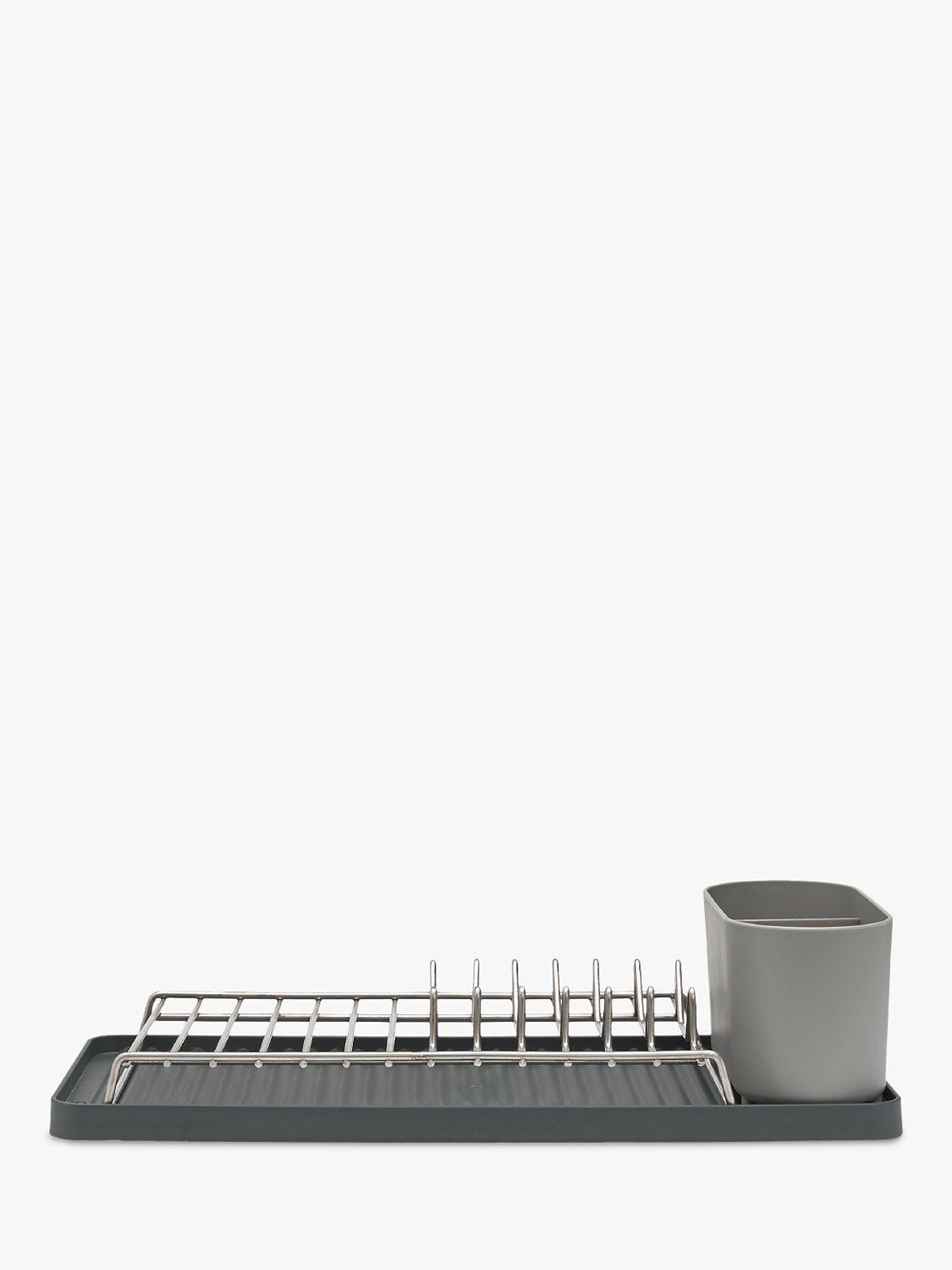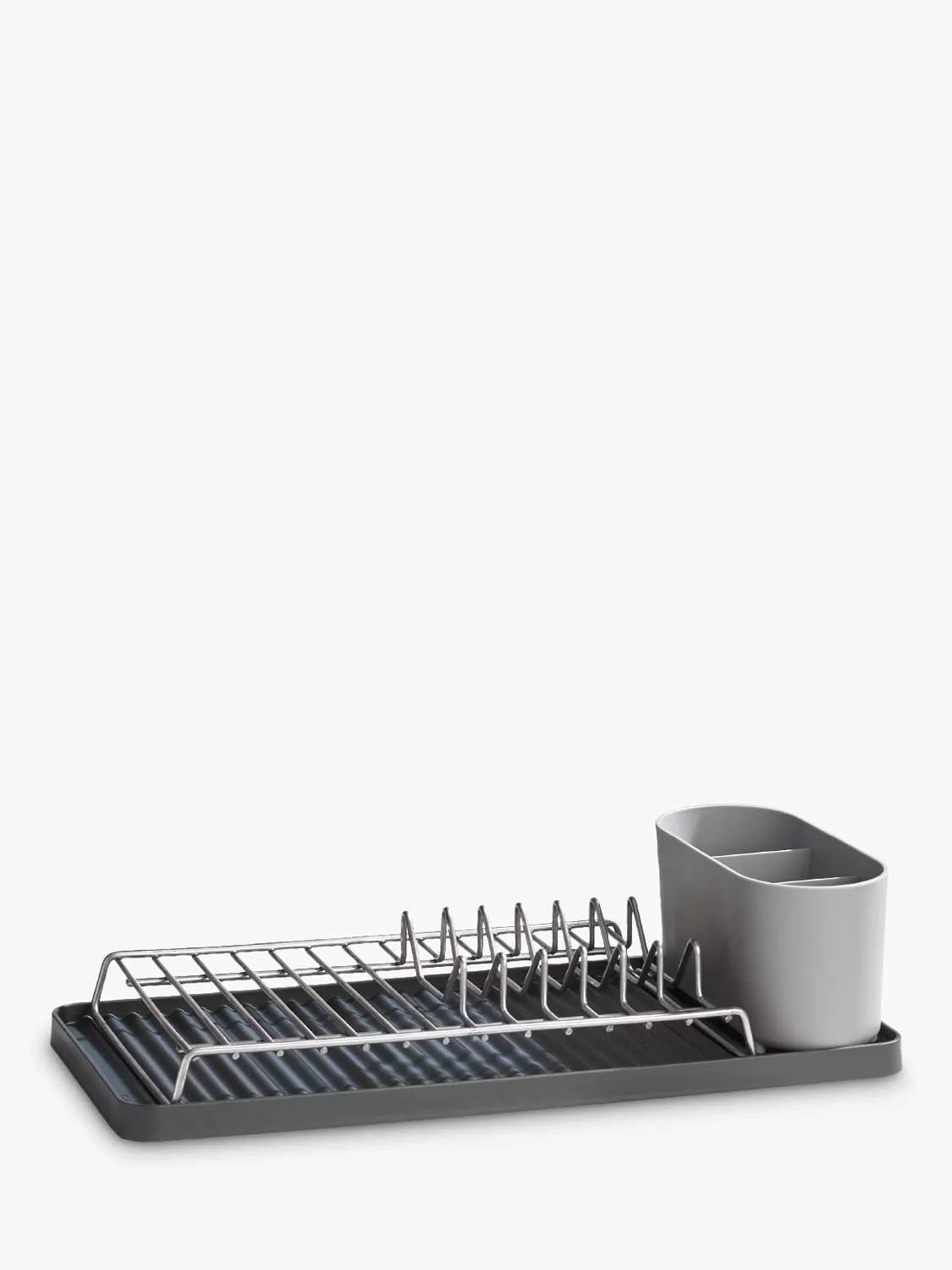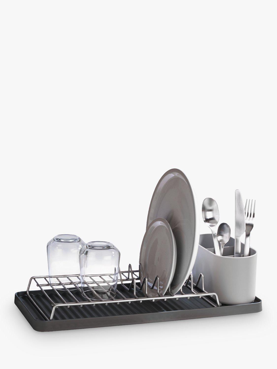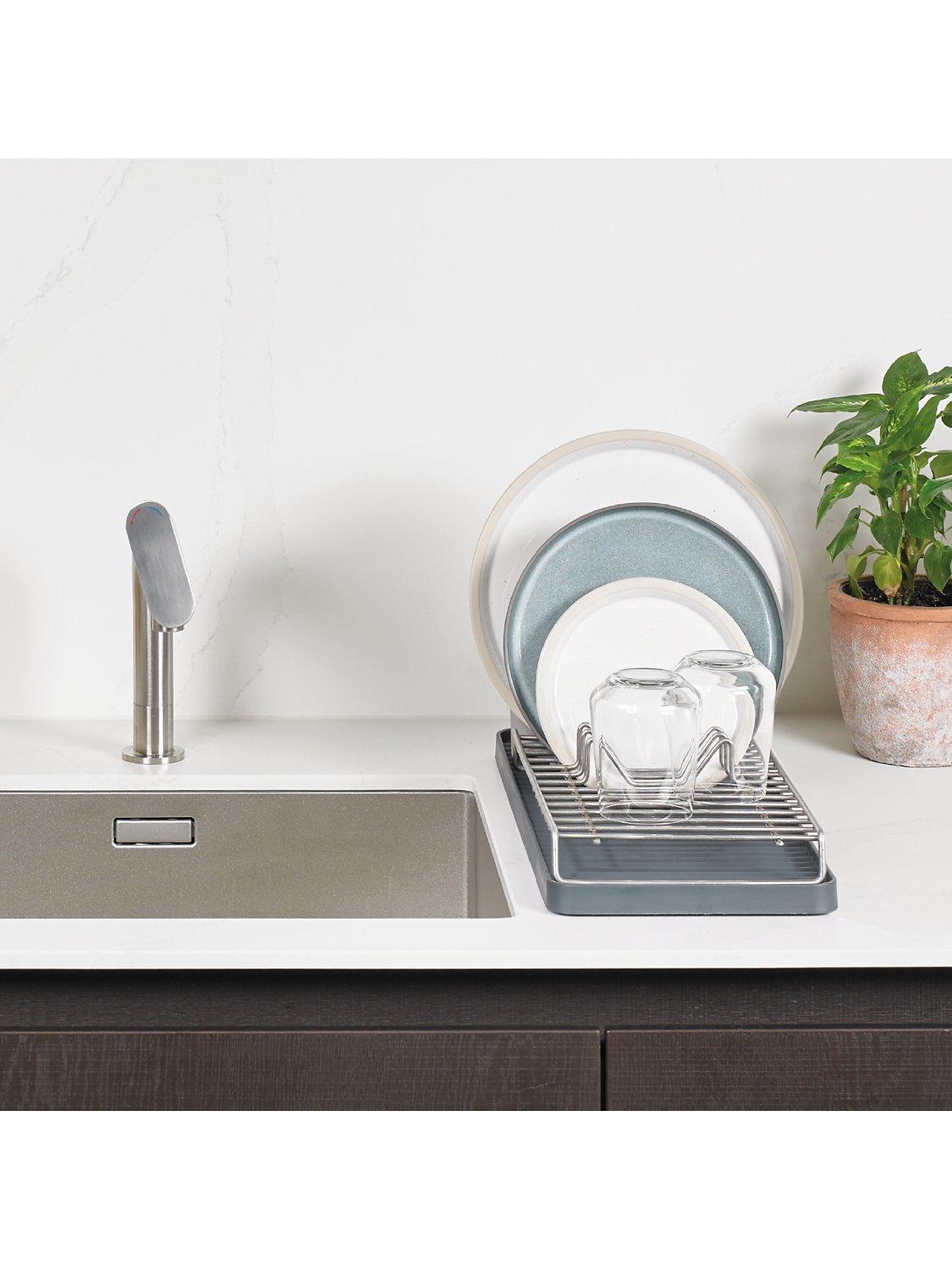 Elegant and space-efficient, this compact dish rack from ReBorn is great if you have limited space. It holds up to six dinner plates and is also suitable for glassware, cups and cutlery. The removable cutlery basket has draining holes. The cutlery pot and metal rack and can be removed to create space for larger pans and items.
