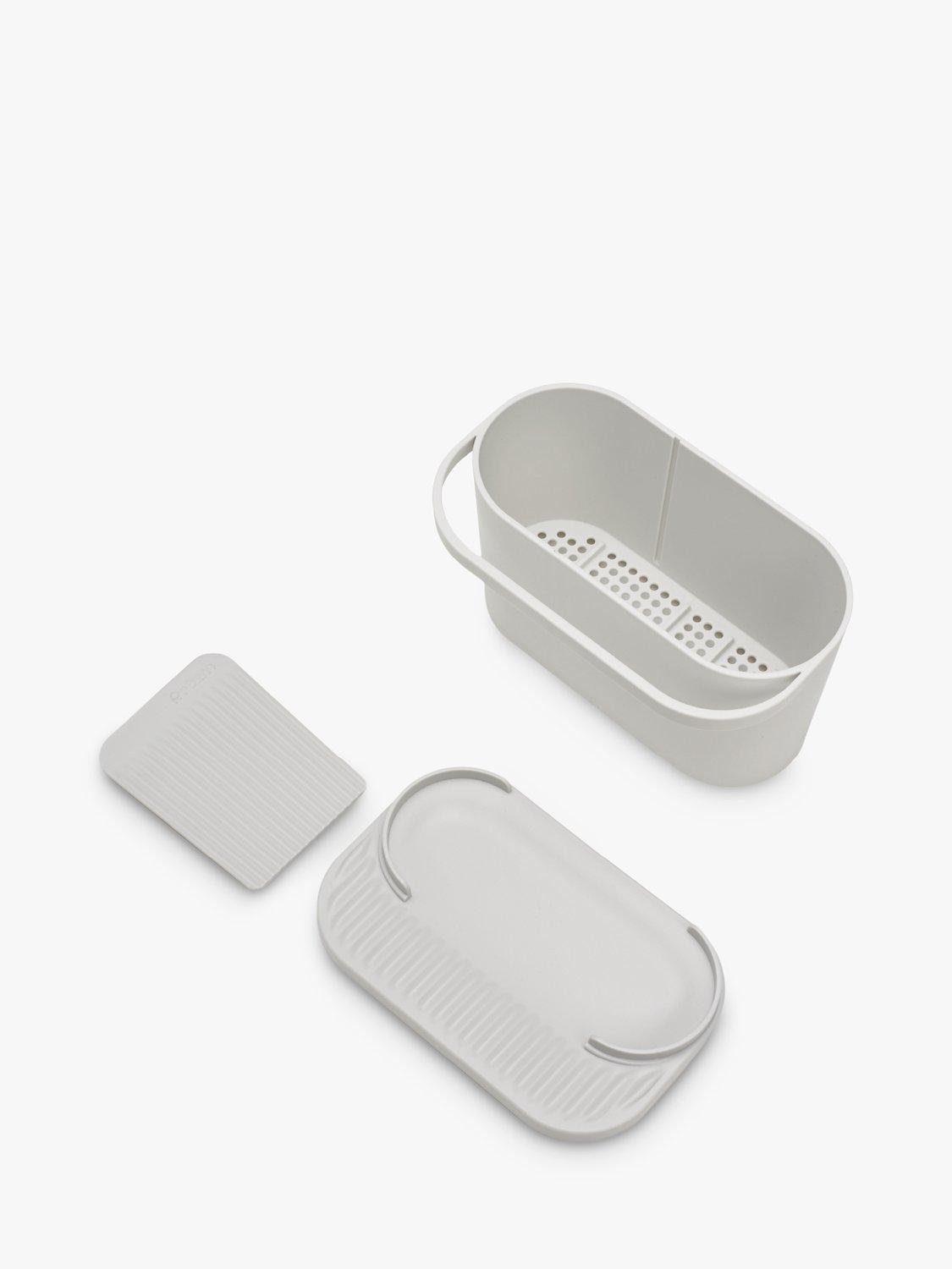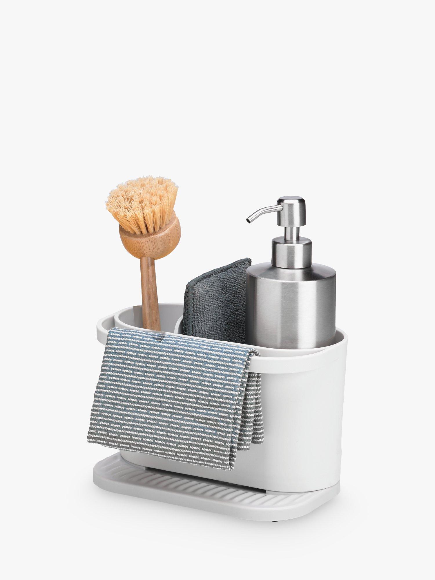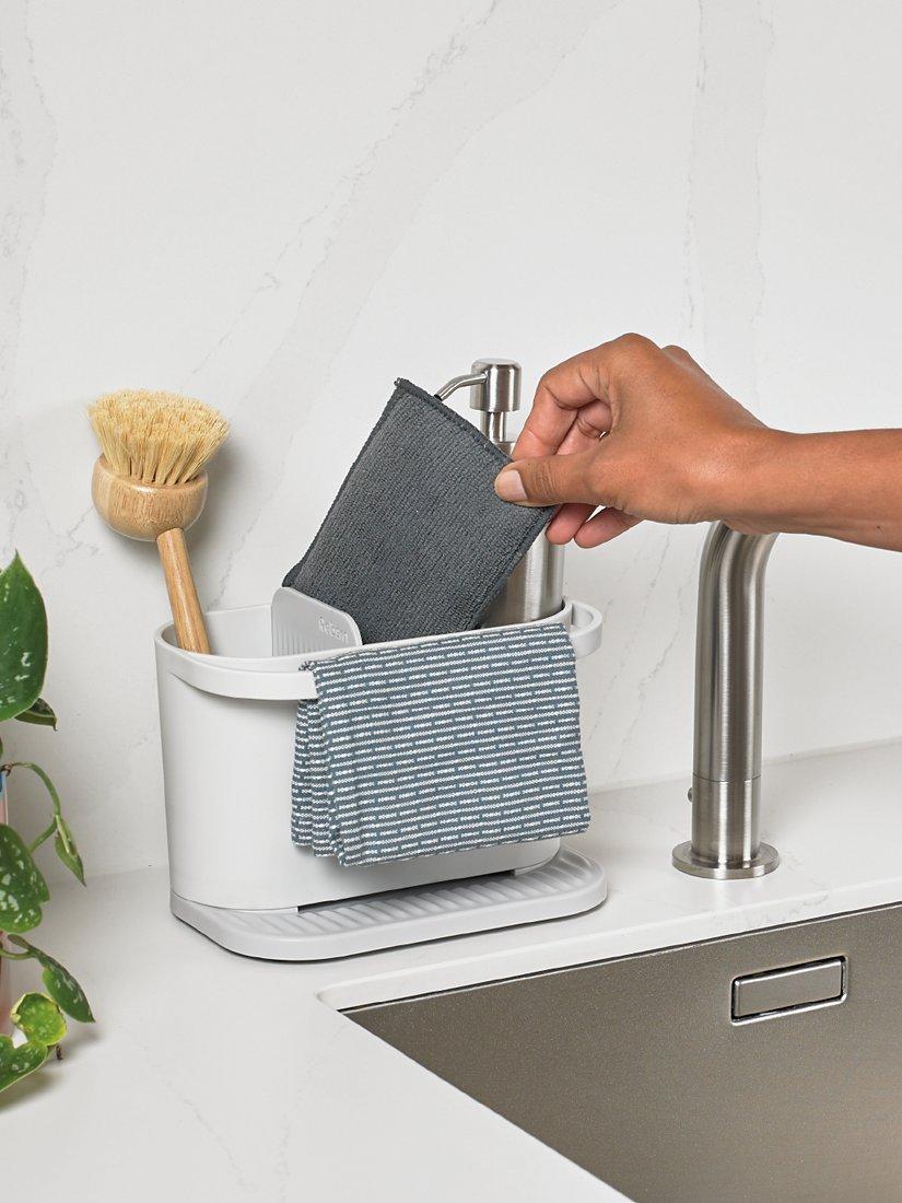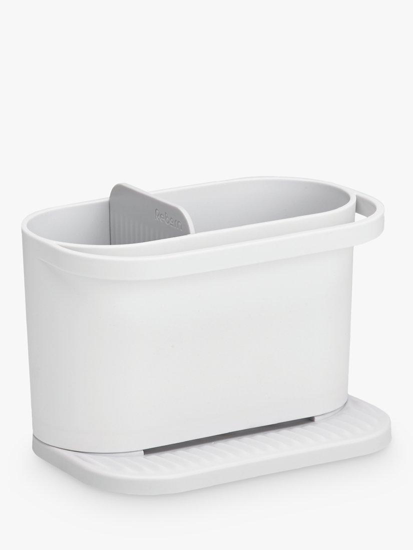 An elegant and space-efficient way to organise your sink area, from ReBorn. The main compartment is divided into two parts and it's large enough for a detergent bottle and brush. The integrated rail is perfect for hanging damp dishcloths.