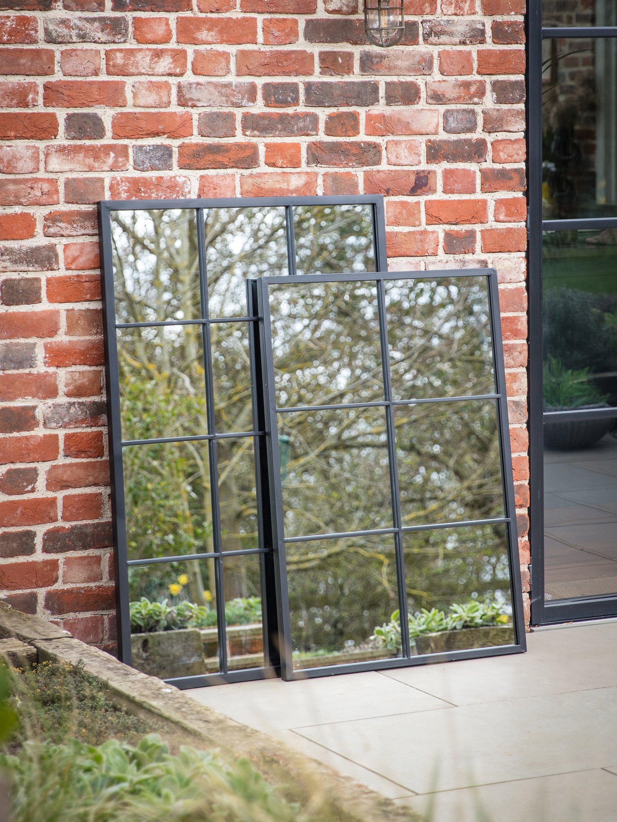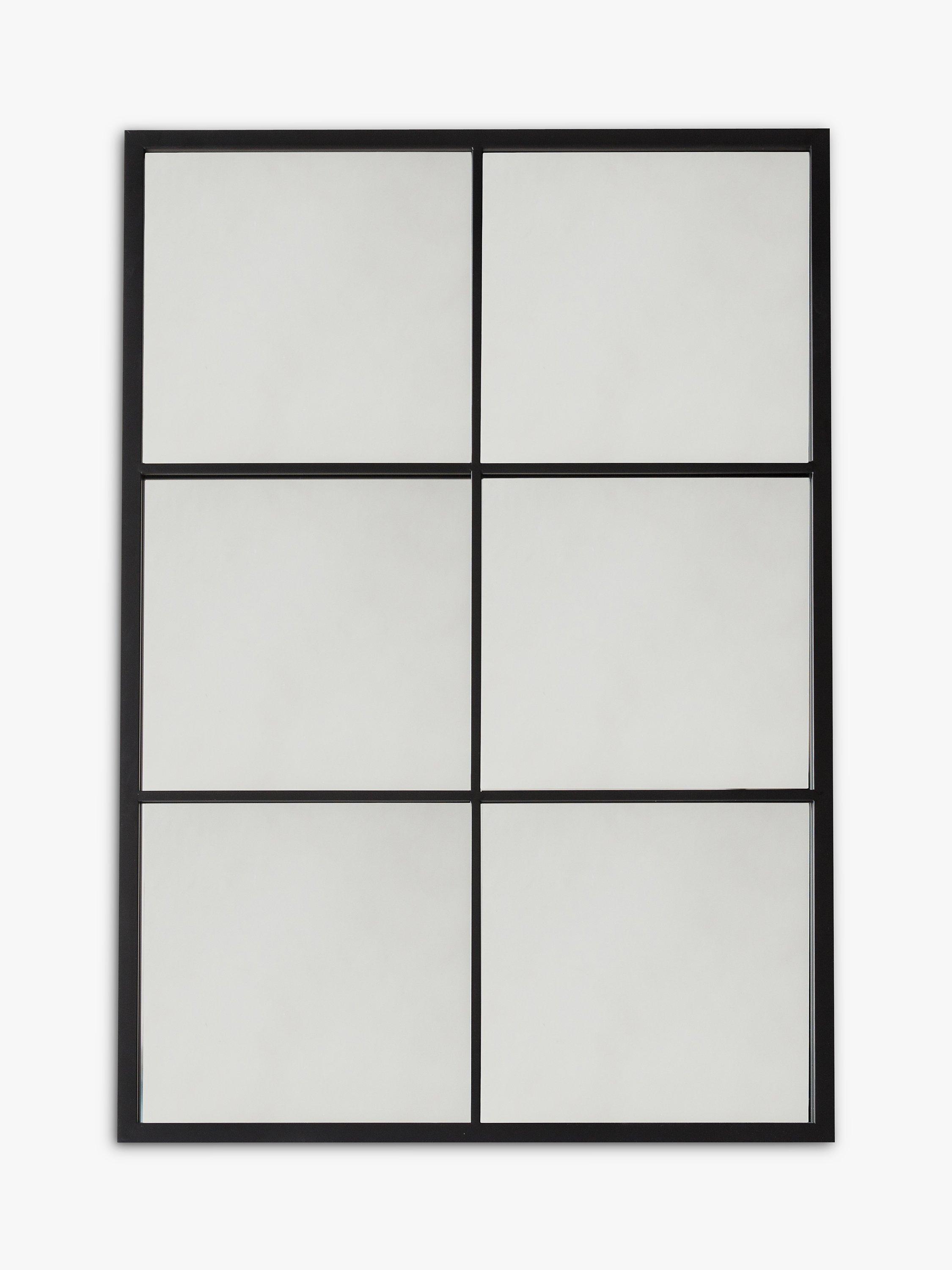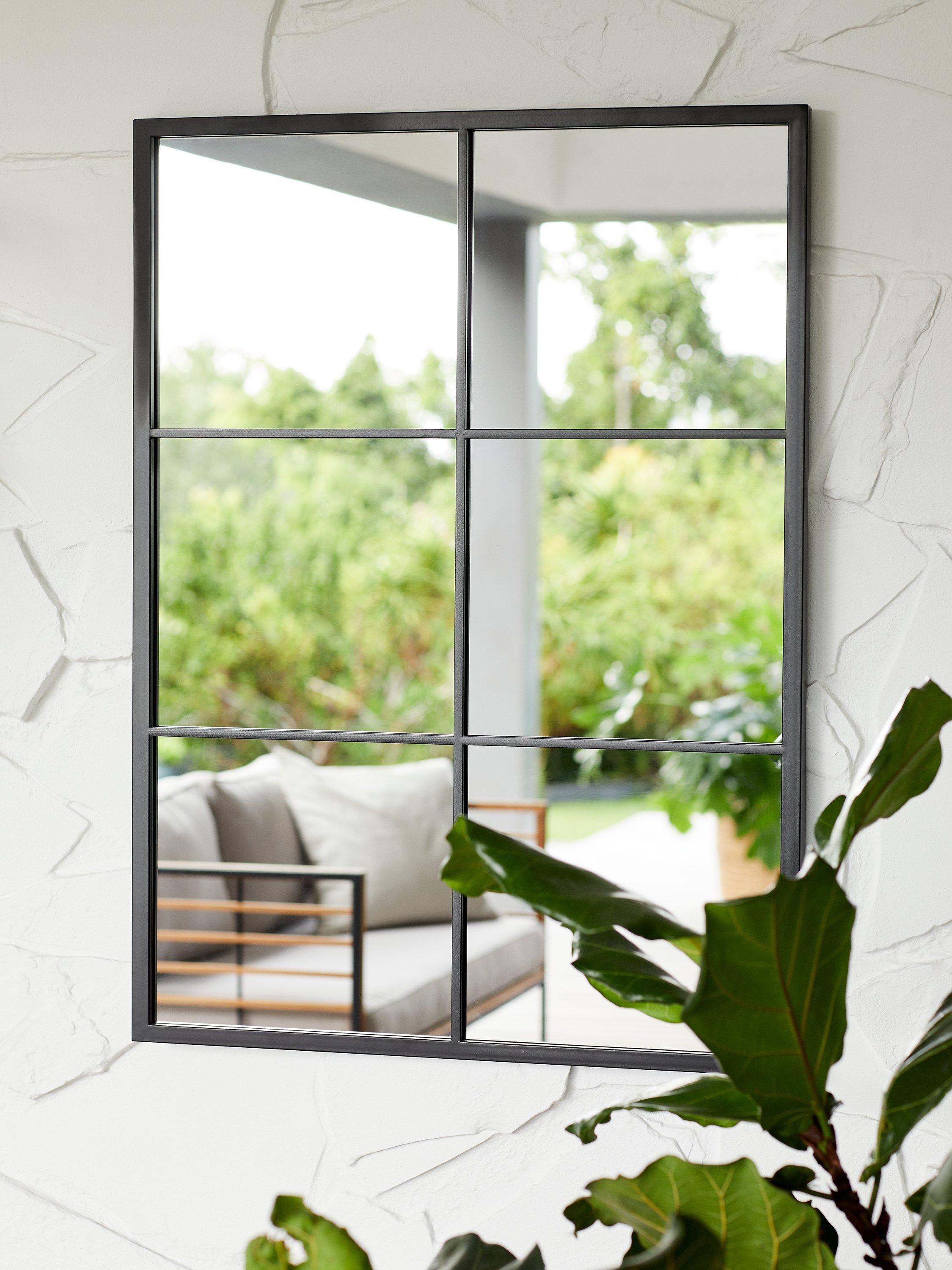 A contemporary rectangular metal frame mirror with six panes of glass. This design has a protective painted finish making it suitable for outdoors as well as indoors. It's ready to hang on your wall using the fittings on the back.