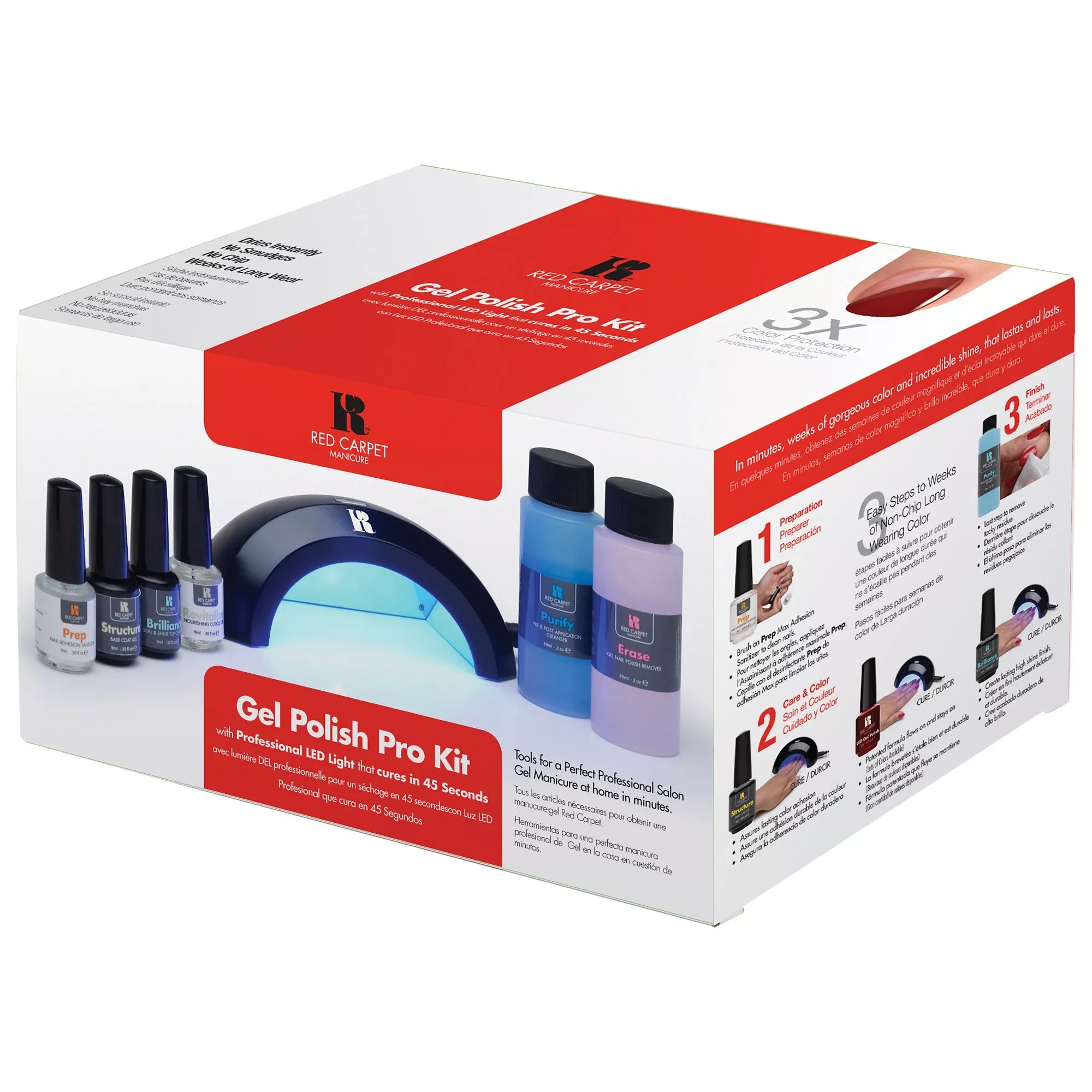 Everything you need for a Red Carpet Manicure in one handy kit. Designed to bring professional level nail glamour into the home, with a quick drying LED light for long-lasting results and all the care products you need for incredible shine. Also includes a bottle of Red Carpet Reddy nail polish to get your collection started. Other colours available separately.