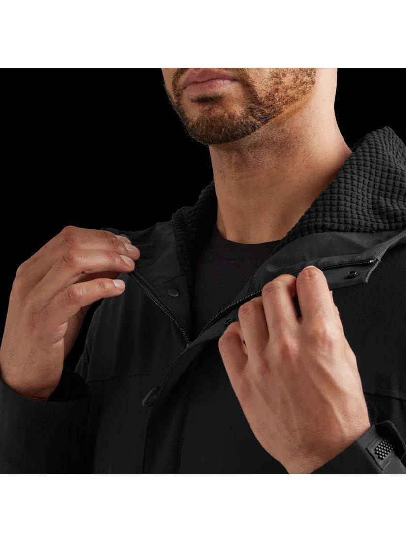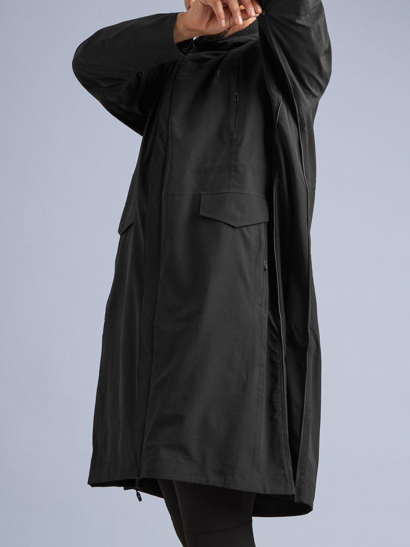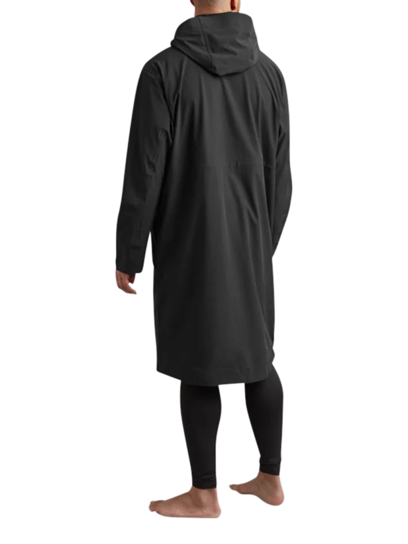 Tailored in soft and stretchy fabric to support movement, hidden zips open to create a spacious changing area, or zip away when not in use. The soft gride fleece liner wicks away moisture, supporting you pre and post sport. A poppered baffle and adjustable peaked hood protect against wind and rain.